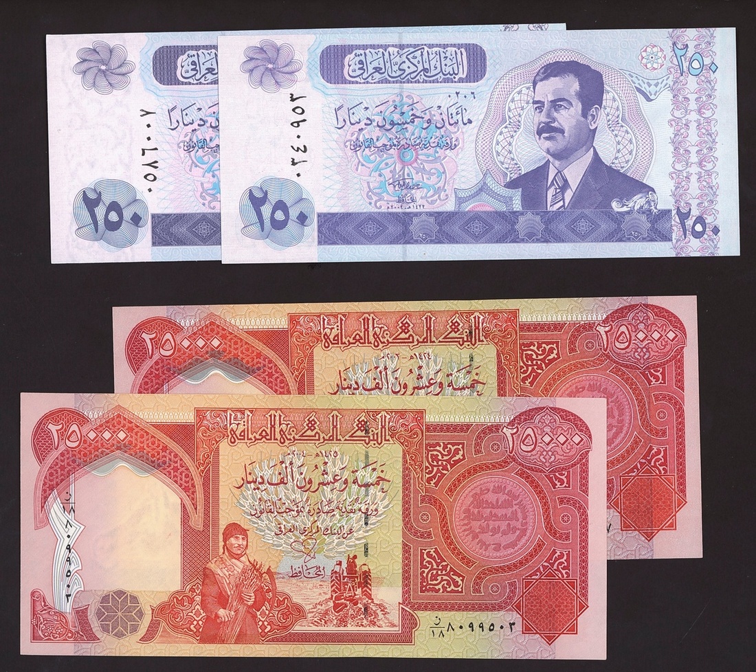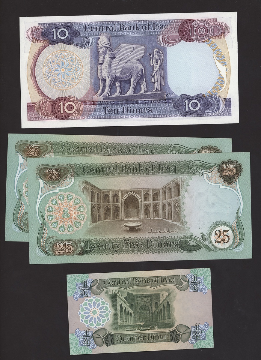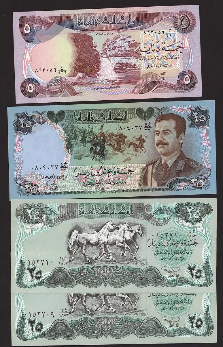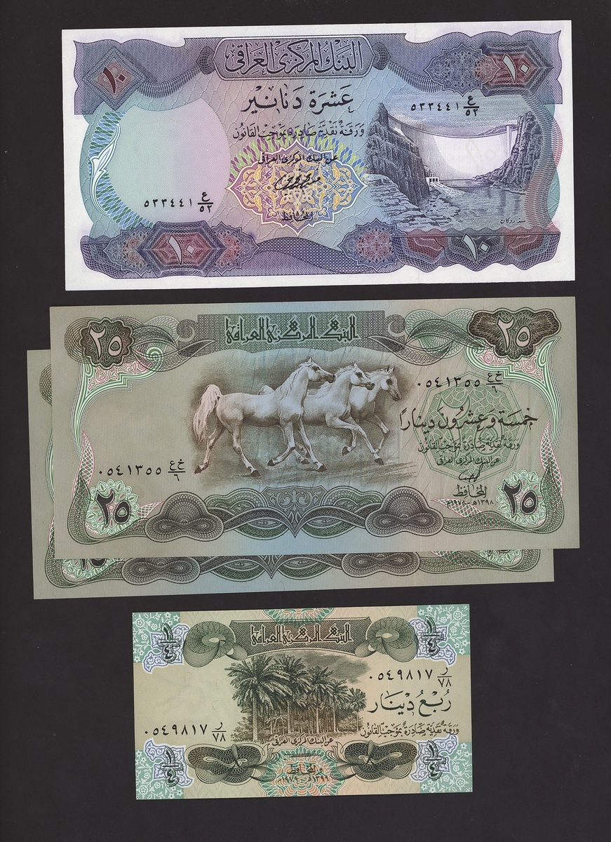 Central Bank of Iraq, including, 10 dinars, 25 dinars (2) 1973-80, 1/4, 1/2, 1 (4), 5 and 25 dinars 1979-86 issues, 25 dinars (2) 1990, 1/4, 1/2, 1, 5 (3) 10 (3) dinars. 1992-93 issues, 50, 100 (2), 250 (2) dinars 1994-95 issues, 25 (4), 100 (2), 250 (2) 2001-02 issues, 50, 250, 500 (5), 1000 (2), 25,000 (2),