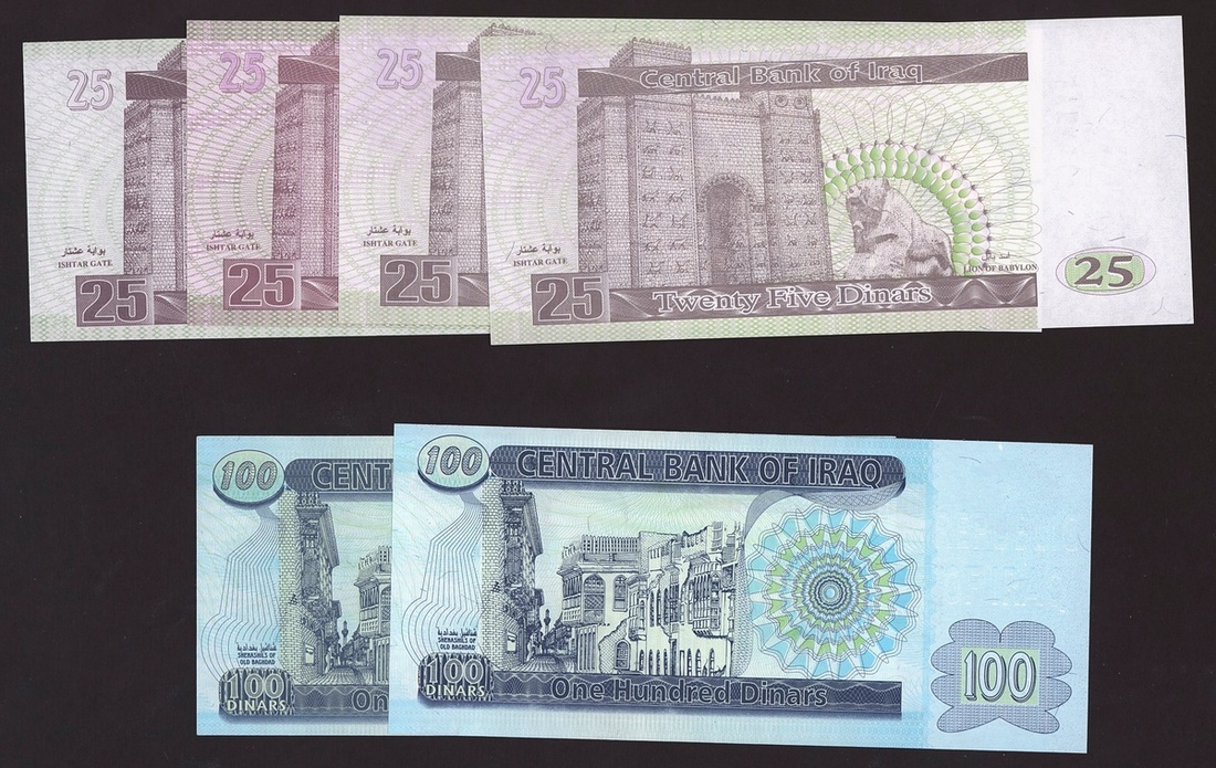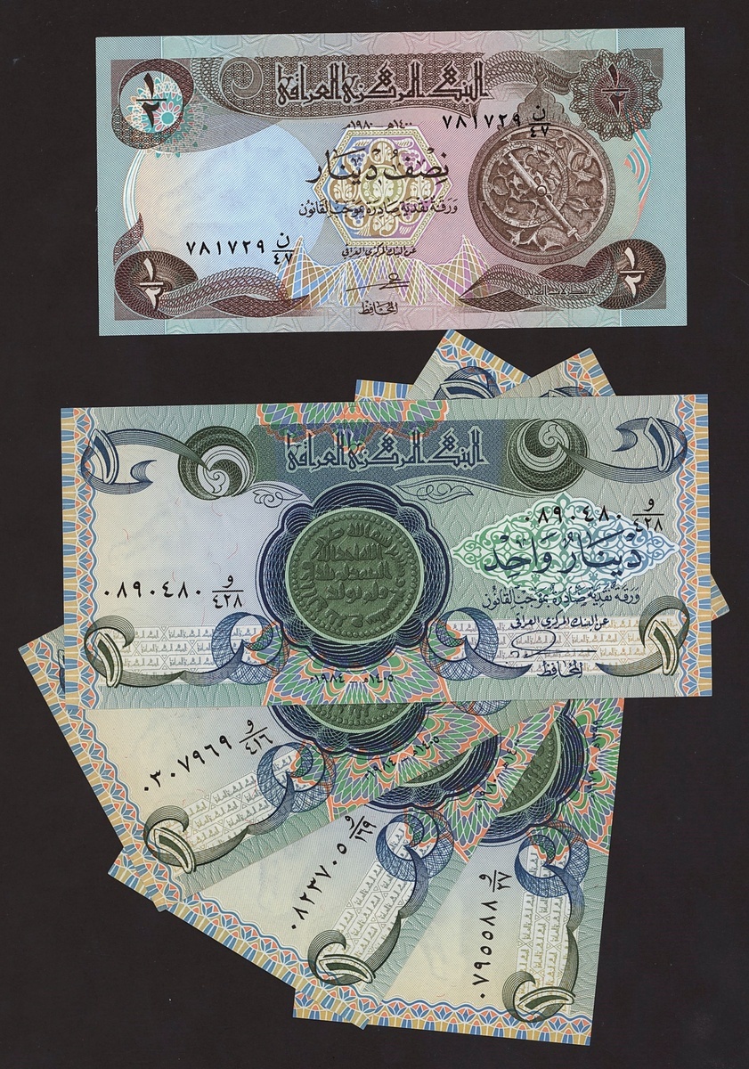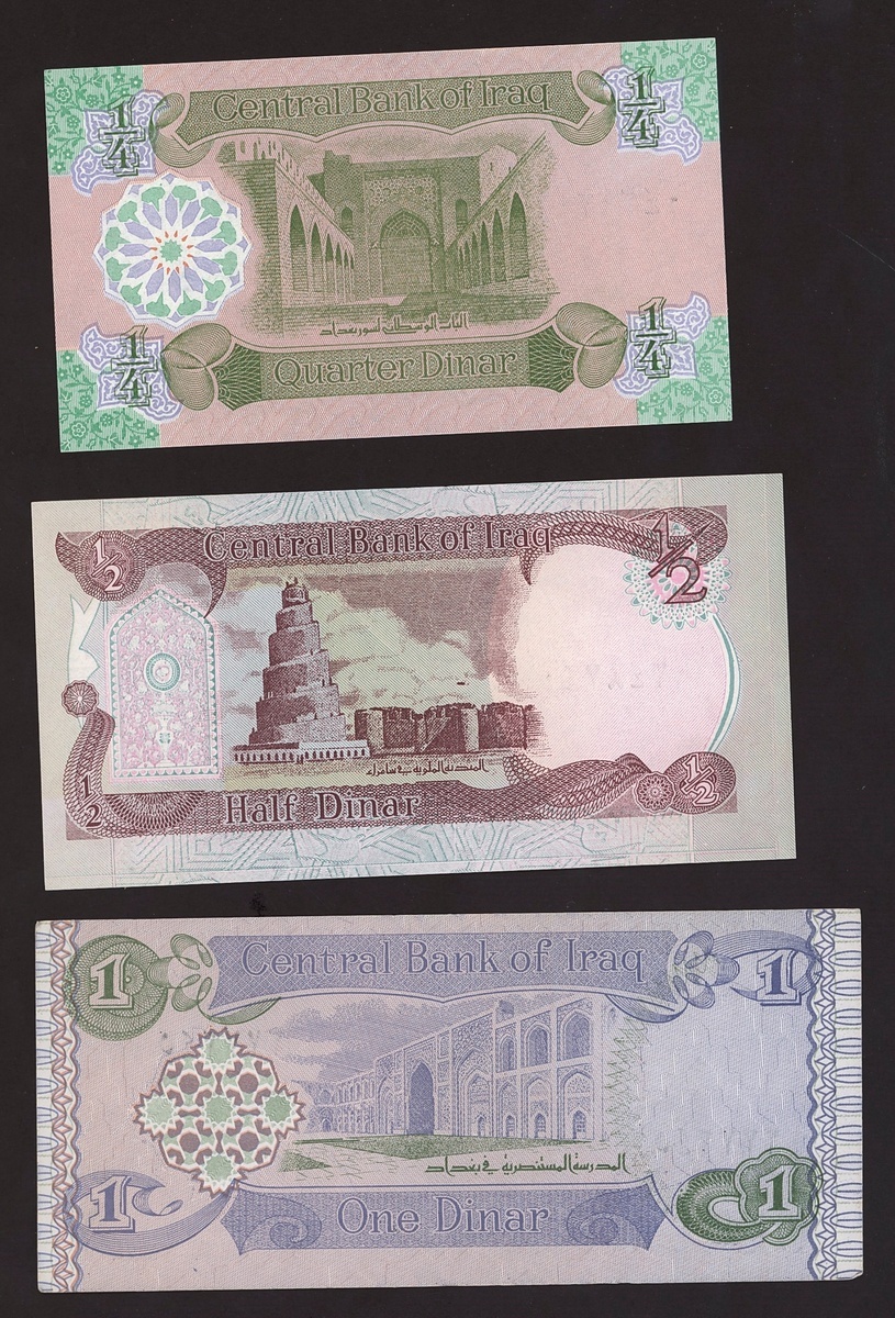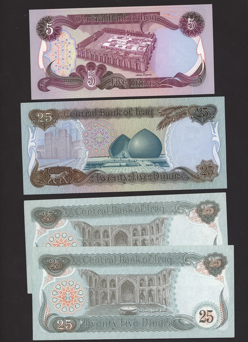 Central Bank of Iraq, including, 10 dinars, 25 dinars (2) 1973-80, 1/4, 1/2, 1 (4), 5 and 25 dinars 1979-86 issues, 25 dinars (2) 1990, 1/4, 1/2, 1, 5 (3) 10 (3) dinars. 1992-93 issues, 50, 100 (2), 250 (2) dinars 1994-95 issues, 25 (4), 100 (2), 250 (2) 2001-02 issues, 50, 250, 500 (5), 1000 (2), 25,000 (2),