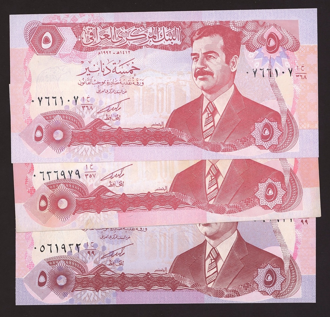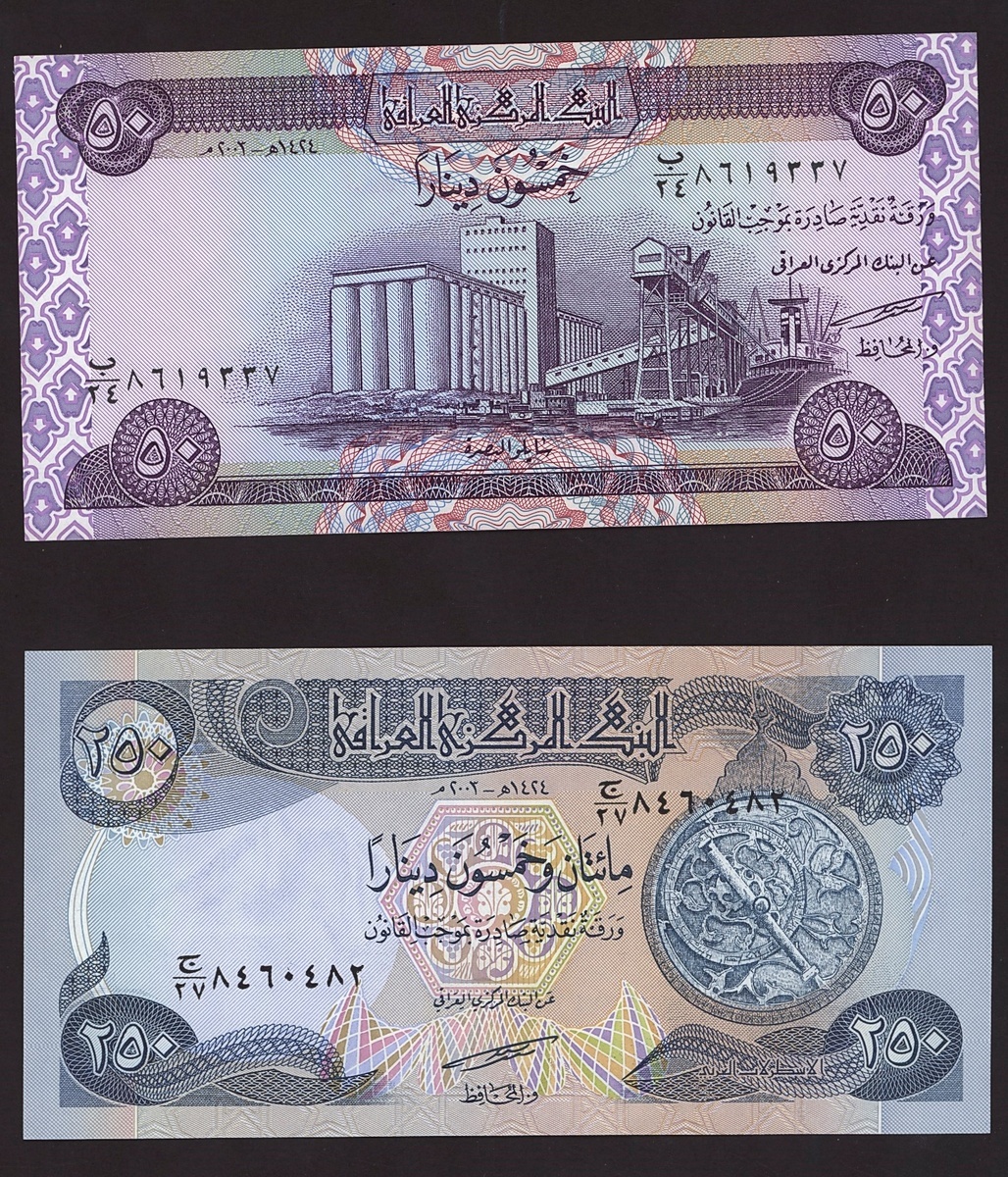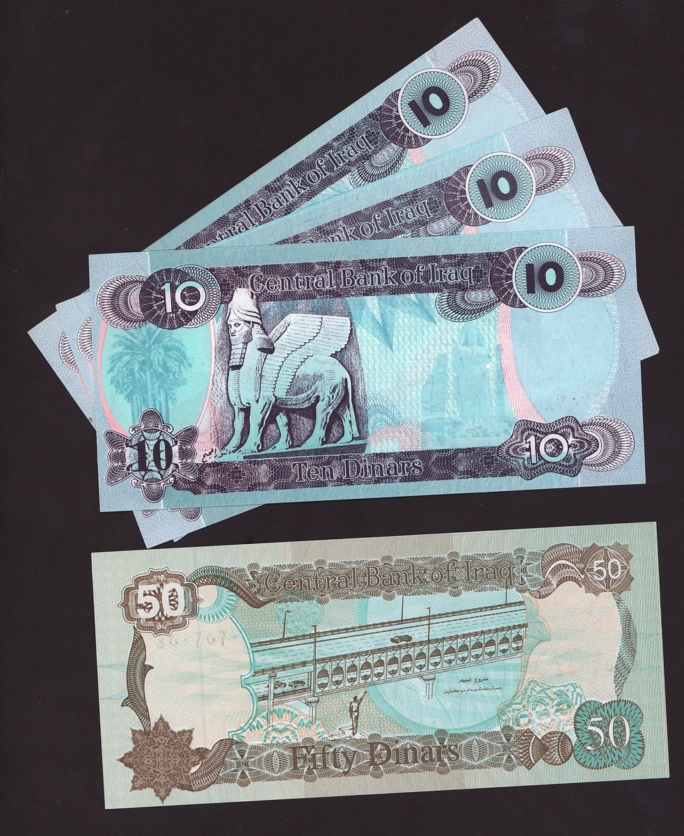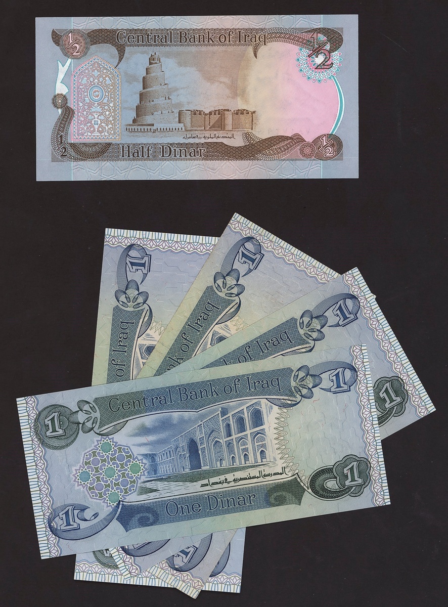 Central Bank of Iraq, including, 10 dinars, 25 dinars (2) 1973-80, 1/4, 1/2, 1 (4), 5 and 25 dinars 1979-86 issues, 25 dinars (2) 1990, 1/4, 1/2, 1, 5 (3) 10 (3) dinars. 1992-93 issues, 50, 100 (2), 250 (2) dinars 1994-95 issues, 25 (4), 100 (2), 250 (2) 2001-02 issues, 50, 250, 500 (5), 1000 (2), 25,000 (2),