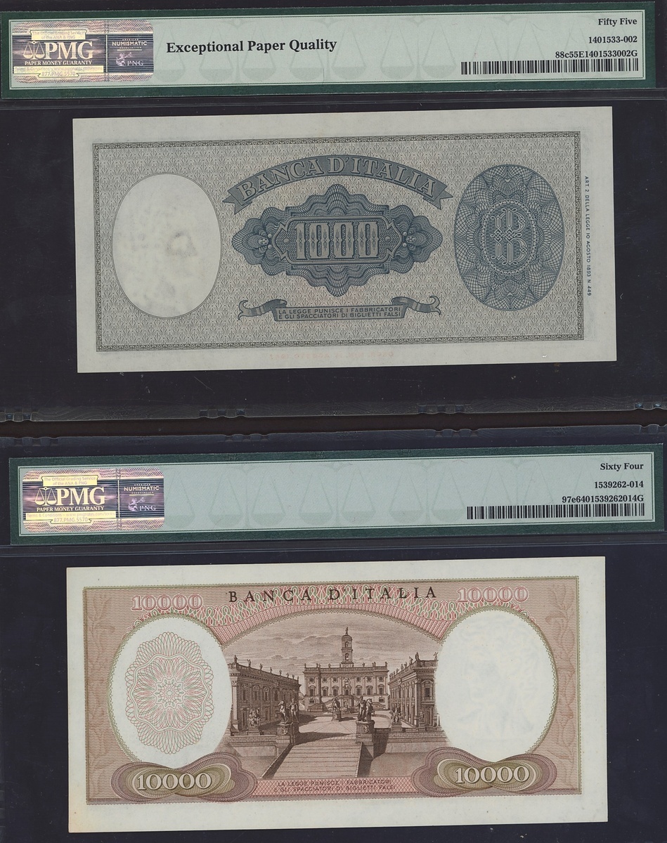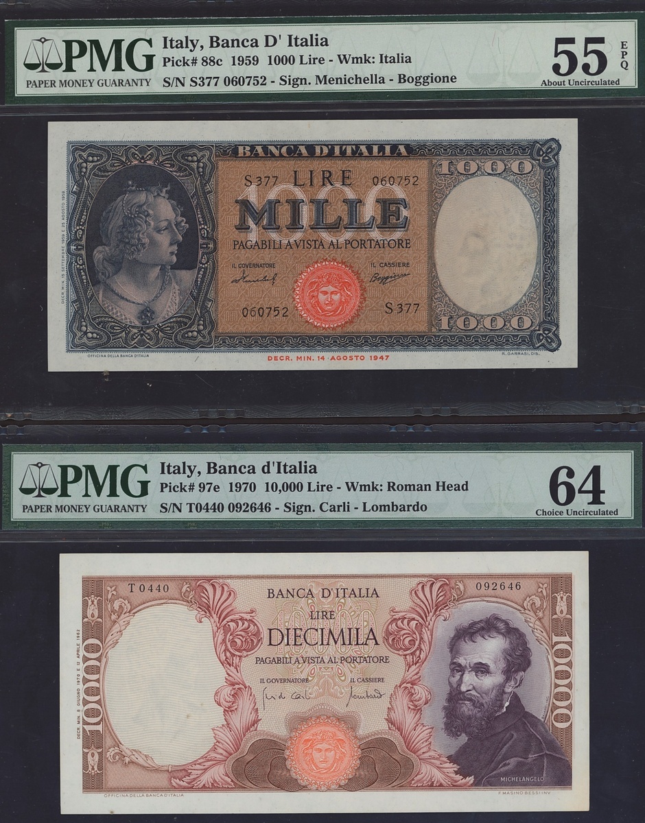 (x) Banca d'Italia, 10,000 lire, 1970, serial number T0440 092646, also a 1000 lire, 1959, serial number S377 060752,