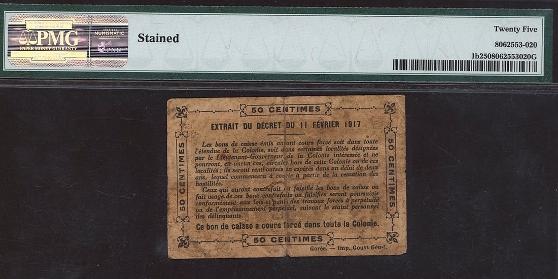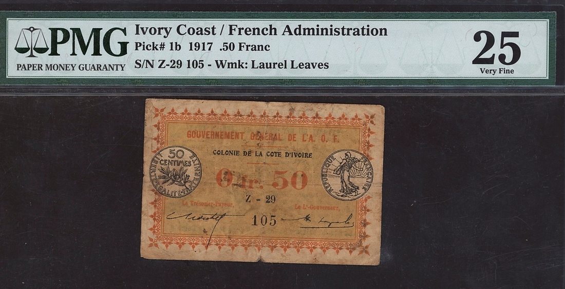 (x) Ivory Coast, 0.50 franc, 1917, serial number Z-29 105, (Pick 1b), in PMG holder 25 Very Fine