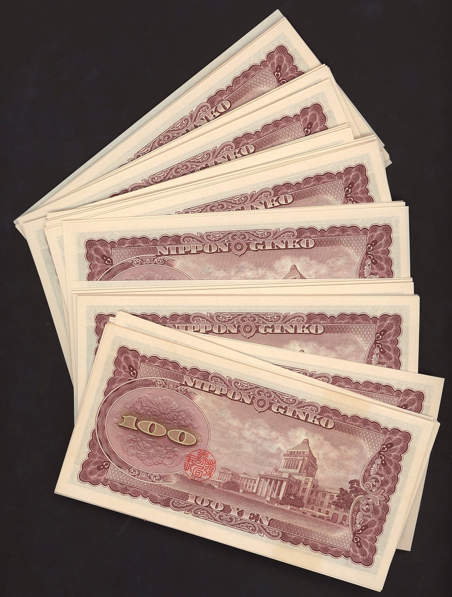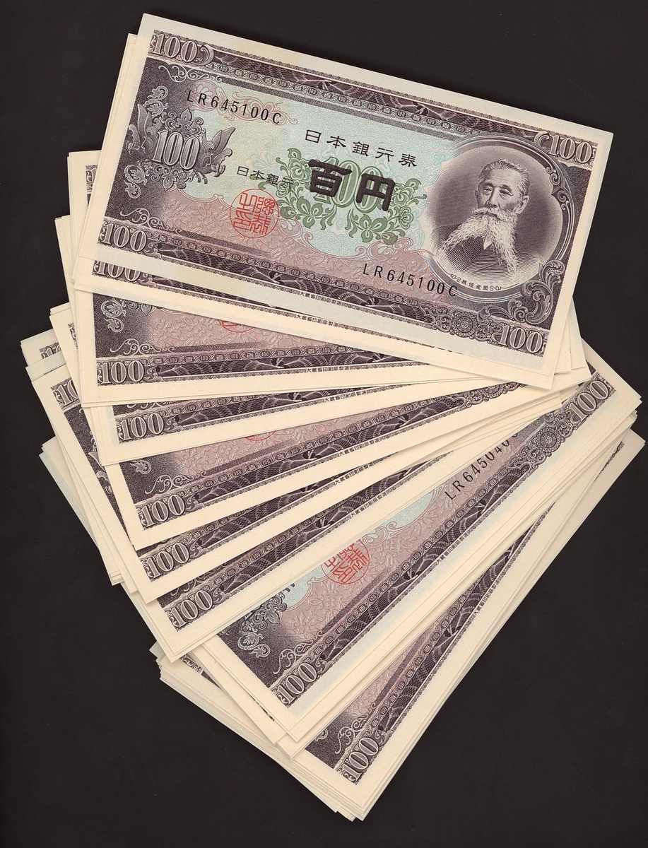 (x) Bank of Japan, a bundle of 100 yen (100), ND (1950-58), serial numbers LR645001C to LR654100C, (Pick 90), as issued (100 notes)