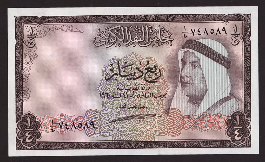 (x) Kuwait Currency Board, 1/4 dinar, 1960, brown and multicoloured, Sheikh Abdullah Al-Salem Al-Saleh at right, signature of Jaber Al-Ahmed Al-Sabah, reverse brown, the Port of Kuwait