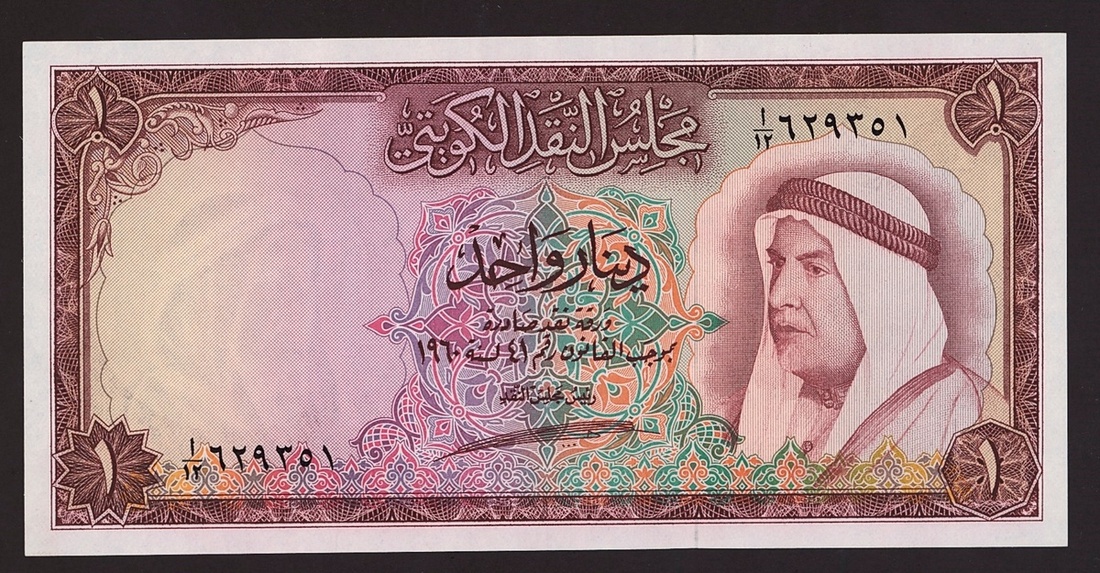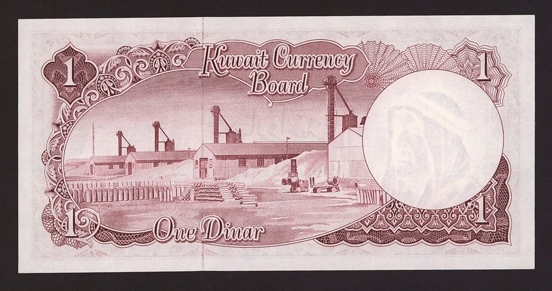 (x) Kuwait Currency Board, 1 dinar, 1961, purple-brown and multicoloured, Sheikh Abdullah Al-Salem Al-Saleh at right, signature of Jaber Al-Ahmed Al-Sabah, reverse brown, cement works