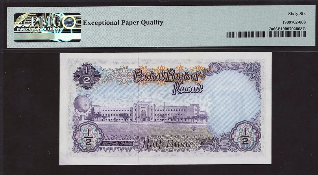 (x) Central Bank of Kuwait, 1/2 dinar, 1968, serial number B/6 433781, (Pick 7a, BNB 202a), in PMG holder 66 EPQ Gem Uncirculated