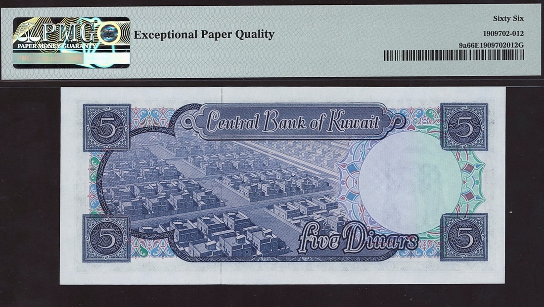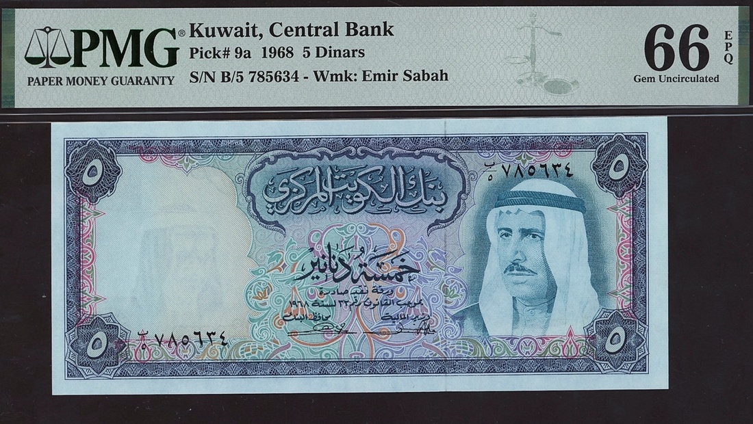 (x) Central Bank of Kuwait, 5 dinars, 1968, serial number B/5 785634, (Pick 9, BNB 204), in PMG holder 66 EPQ Gem Uncirculated