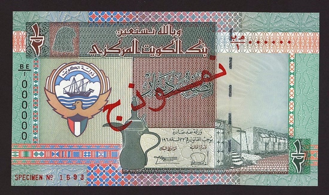 (x) Central Bank of Kuwait, specimen 1/2 dinar, 1994, serial number BE/1 000000, (Pick 24s), uncirculated, first prefix, first signature