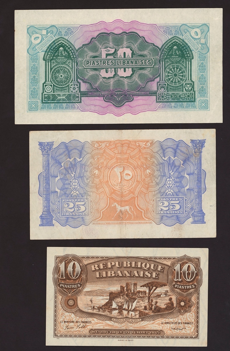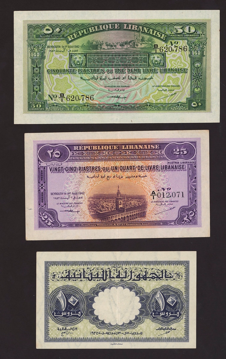 Republique Libanaise, Lebanon, 50 piastres libanises, 1 August 1942, serial number B/1 620,786, also 25 and 10 piastres,