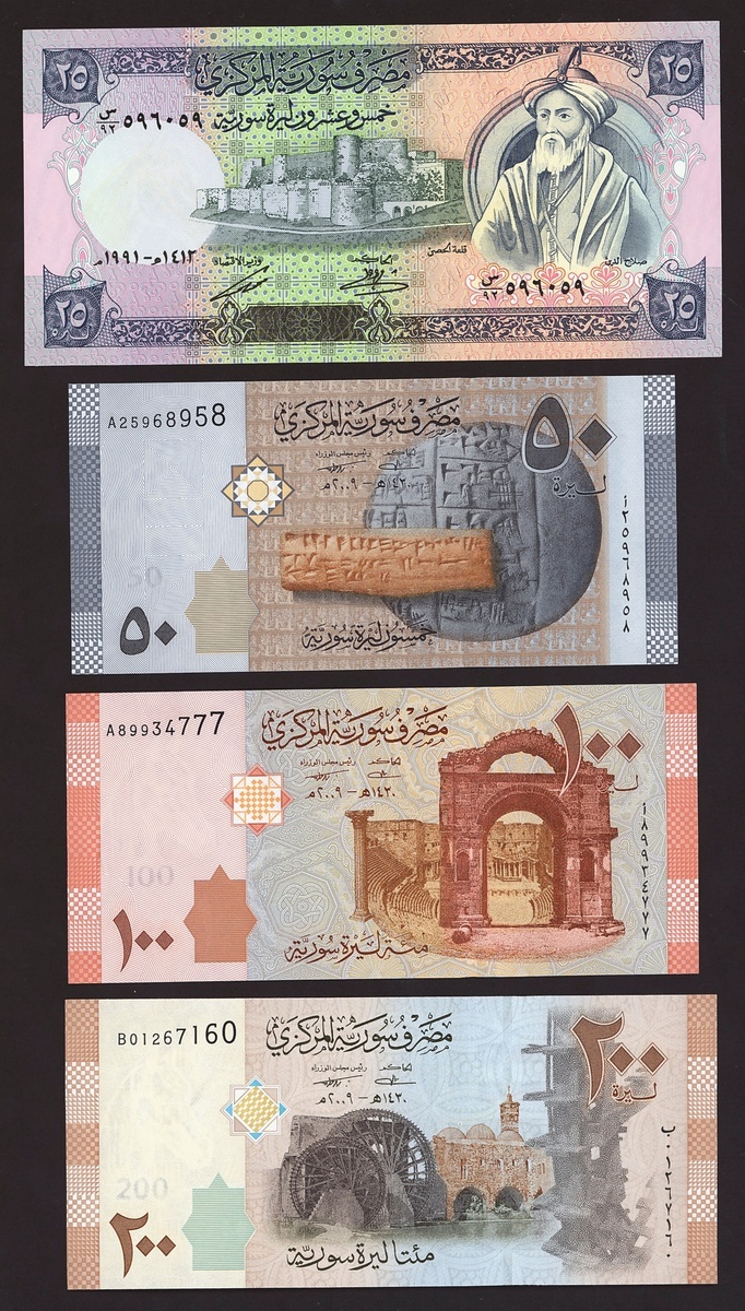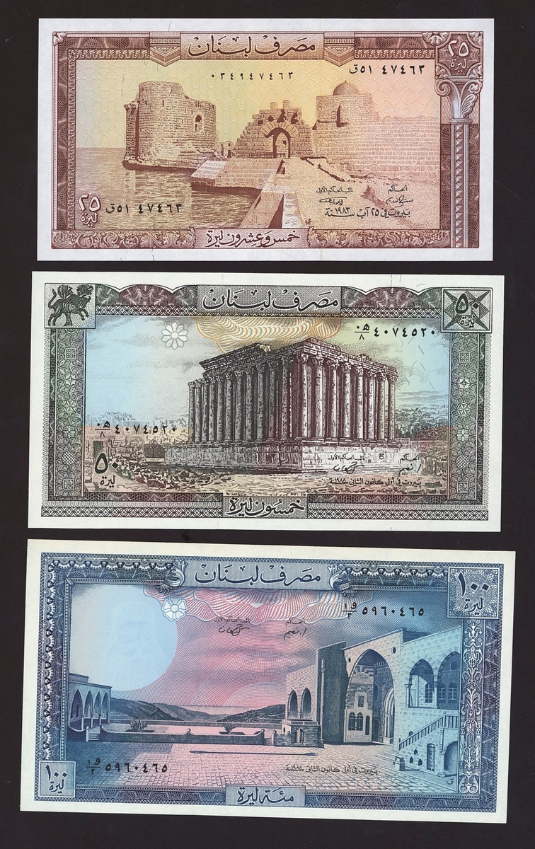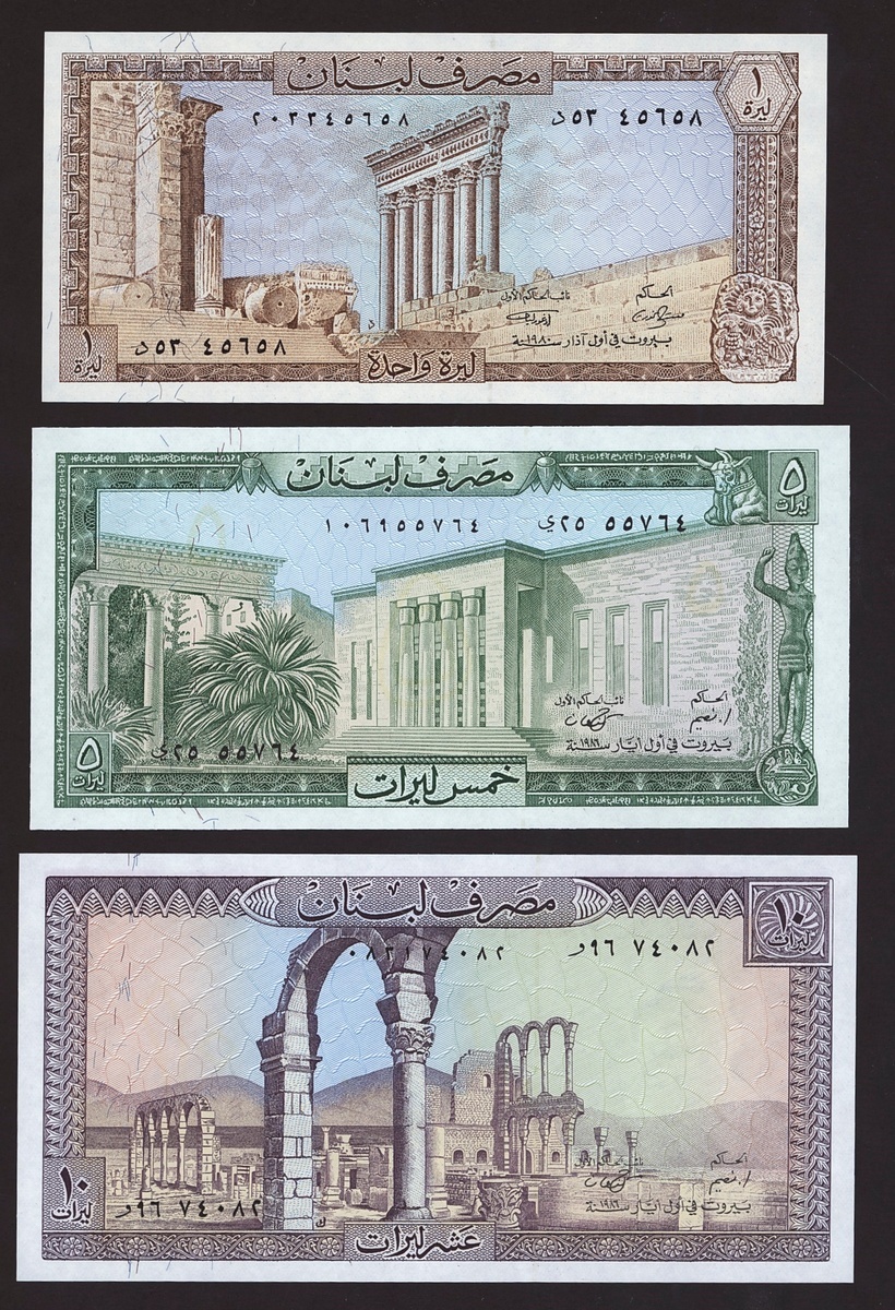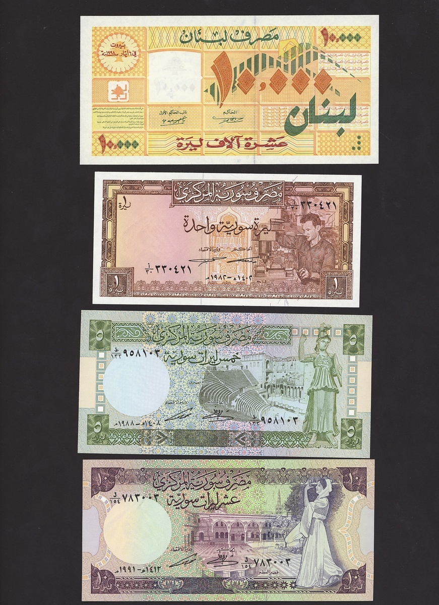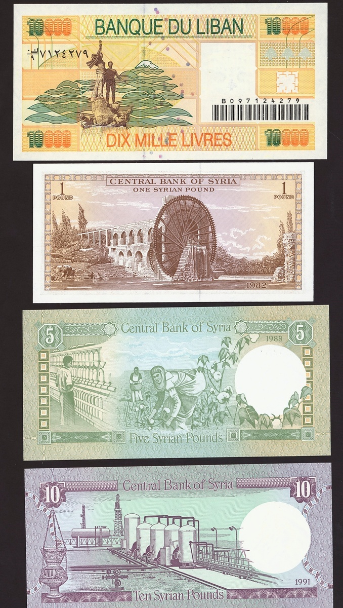 A group of modern Lebanon and Syria notes, including Banque du Liban, 1, 5, 10, 25, 50, 100 and 250 livres 1964-88, 500 and 1000 livres 1988, 10000 livres 1998, Central Bank of Syria, 1 pound 1982, 5, 10 and 25 pounds 1988-91, 50, 100 and 200 pounds 2010,