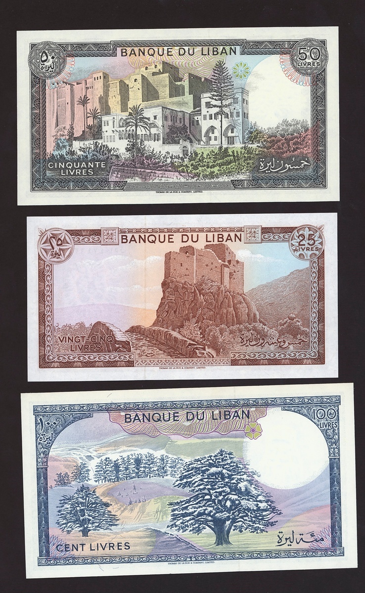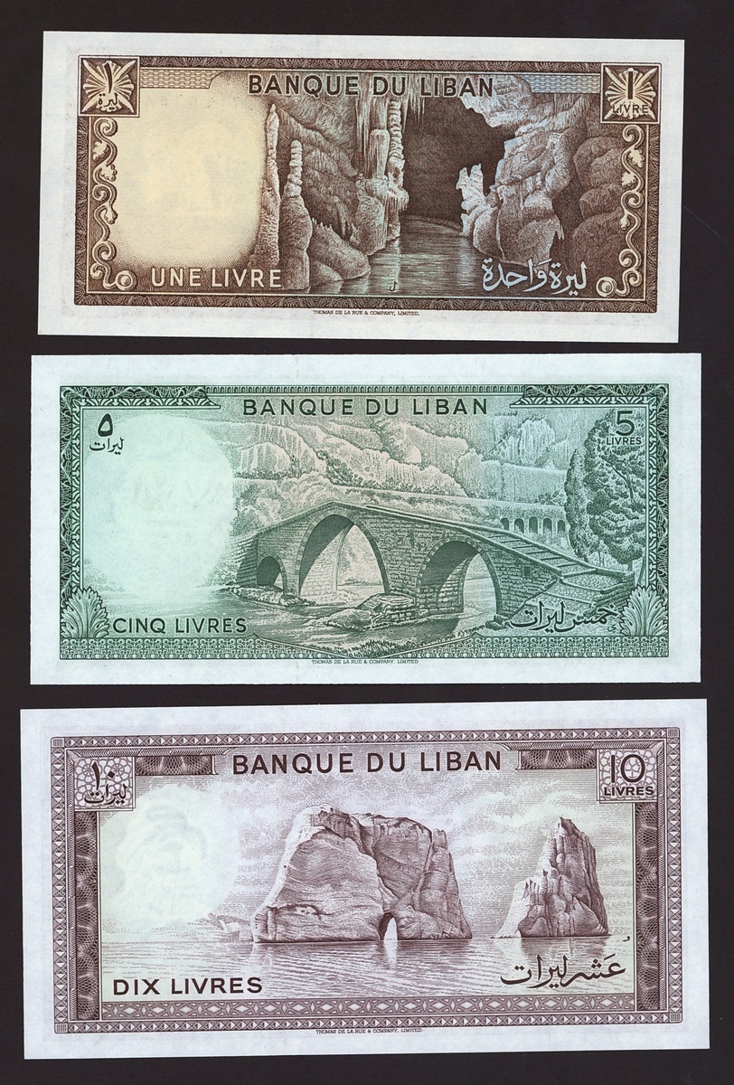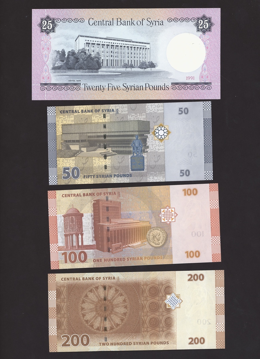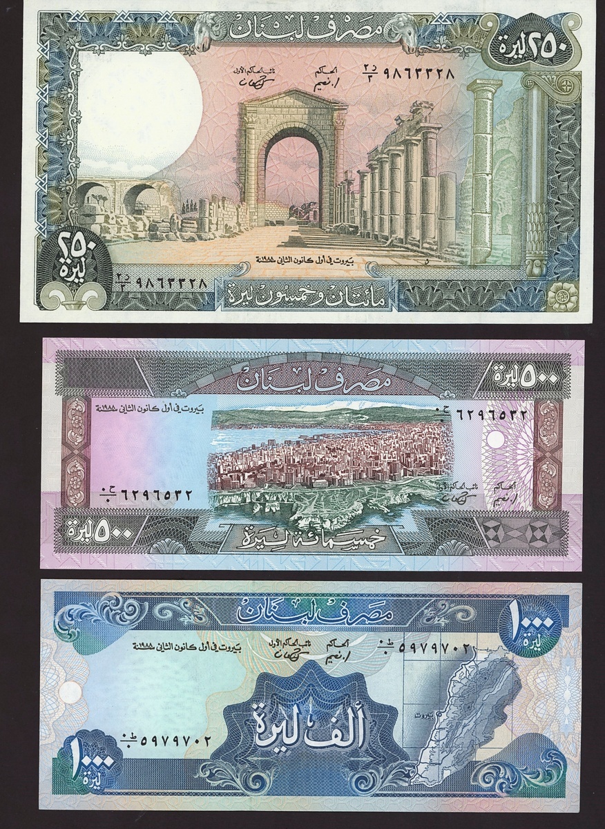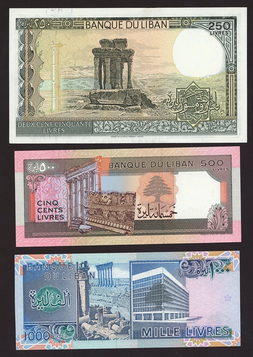 A group of modern Lebanon and Syria notes, including Banque du Liban, 1, 5, 10, 25, 50, 100 and 250 livres 1964-88, 500 and 1000 livres 1988, 10000 livres 1998, Central Bank of Syria, 1 pound 1982, 5, 10 and 25 pounds 1988-91, 50, 100 and 200 pounds 2010,