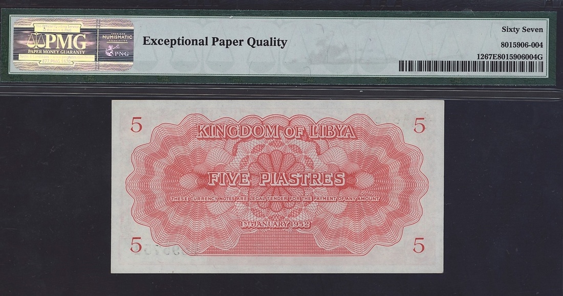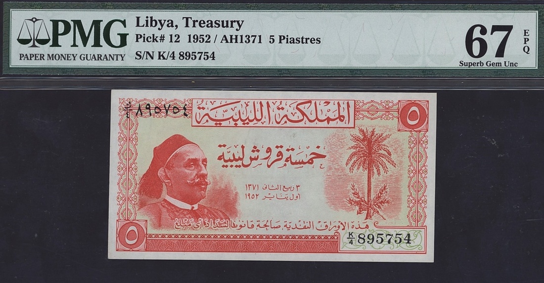 (x) Kingdom of Libya, [Top Pop] 5 piastres, 1952, serial number K/4 895754, (Pick 12), in PMG holder 67 EPQ Superb Gem Uncirculated