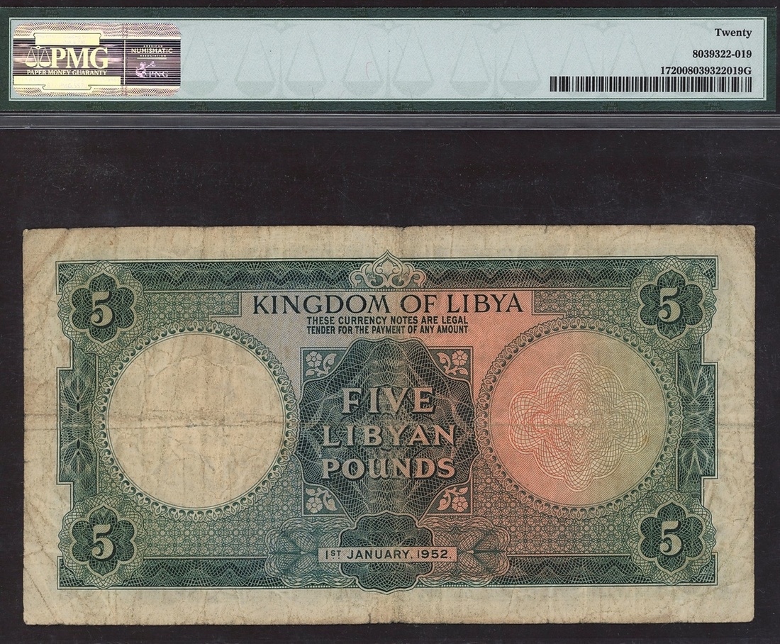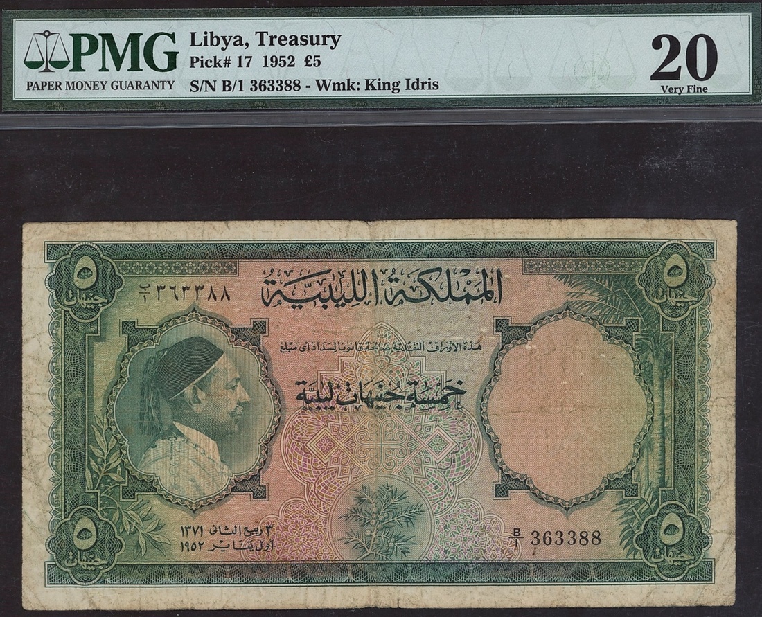(x) Kingdom of Libya, £5, 1952, serial number B/1 363388, (Pick 17), in PMG holder 20 Very Fine