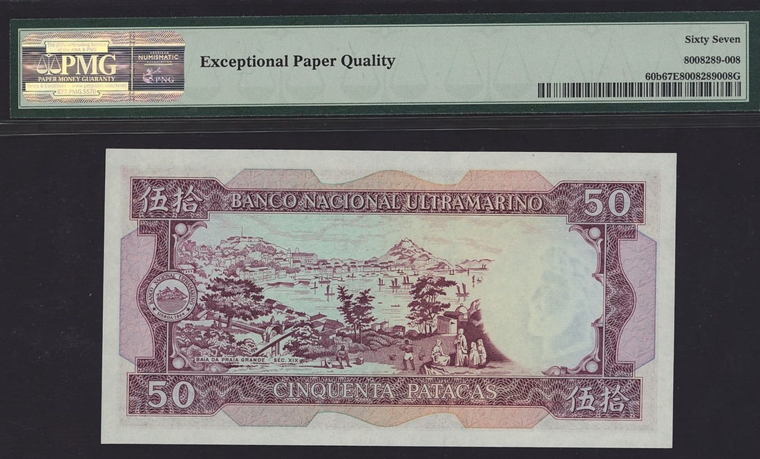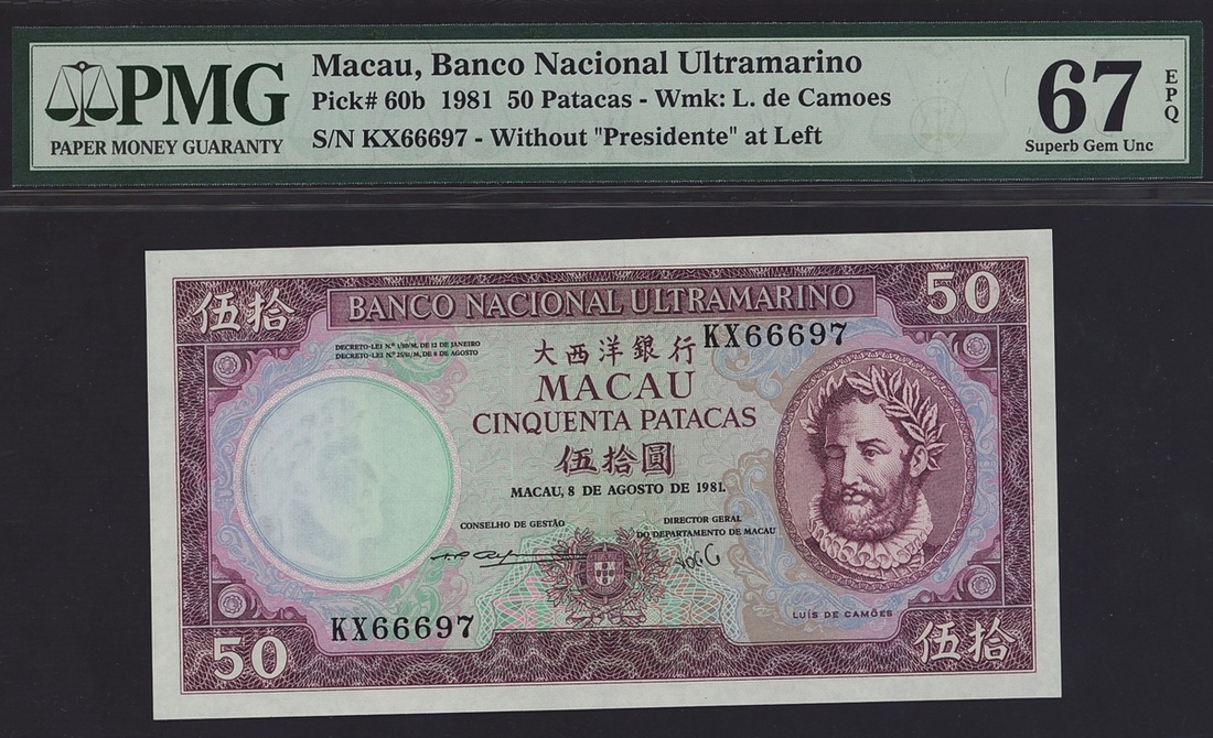 (x) Banco Nacional Ultramarino, Macau, 50 patacas, 8 August 1981, serial number KX66697, (Pick 60b), in PMG holder 67 EPQ Superb Gem Unc