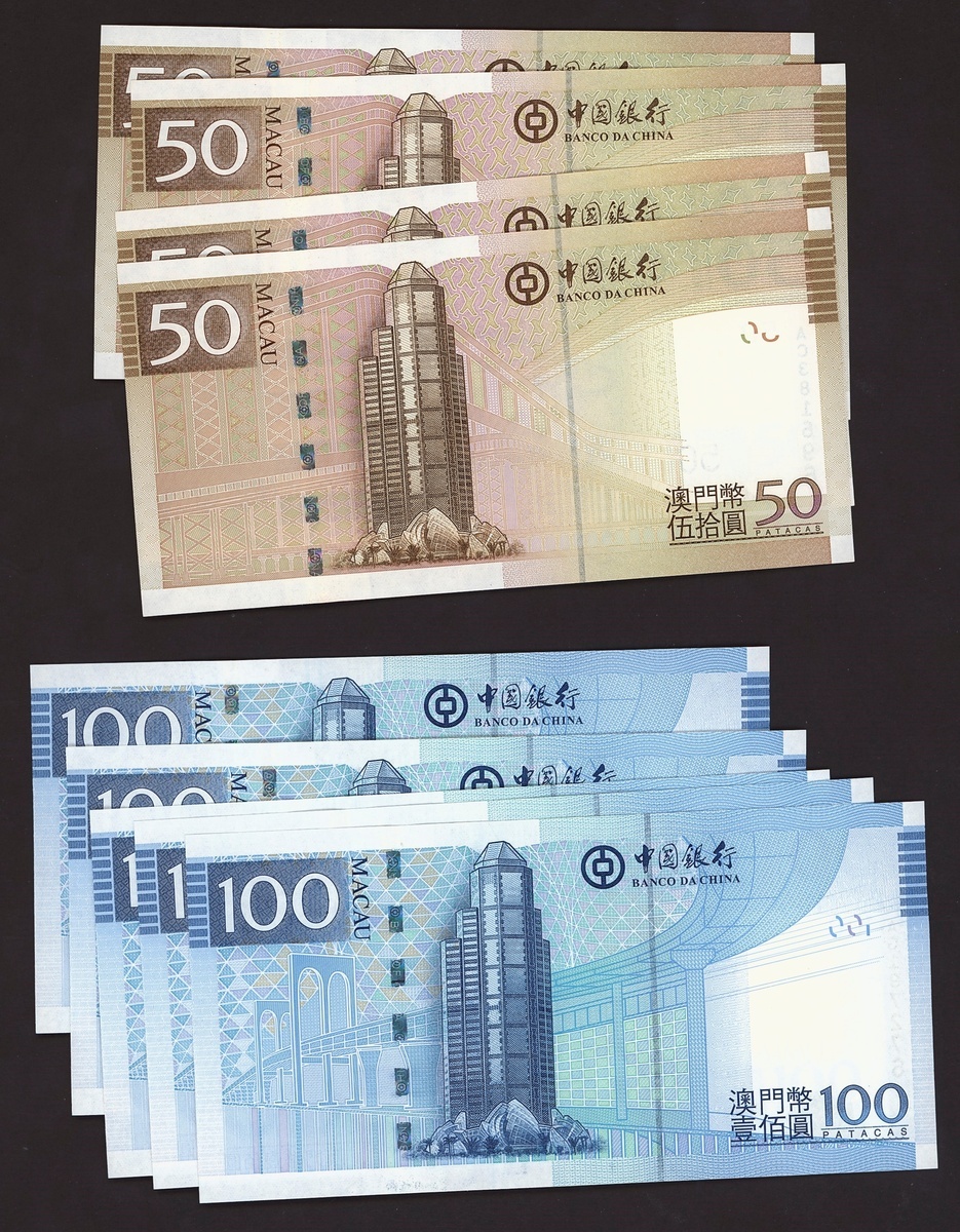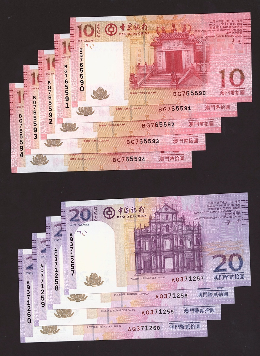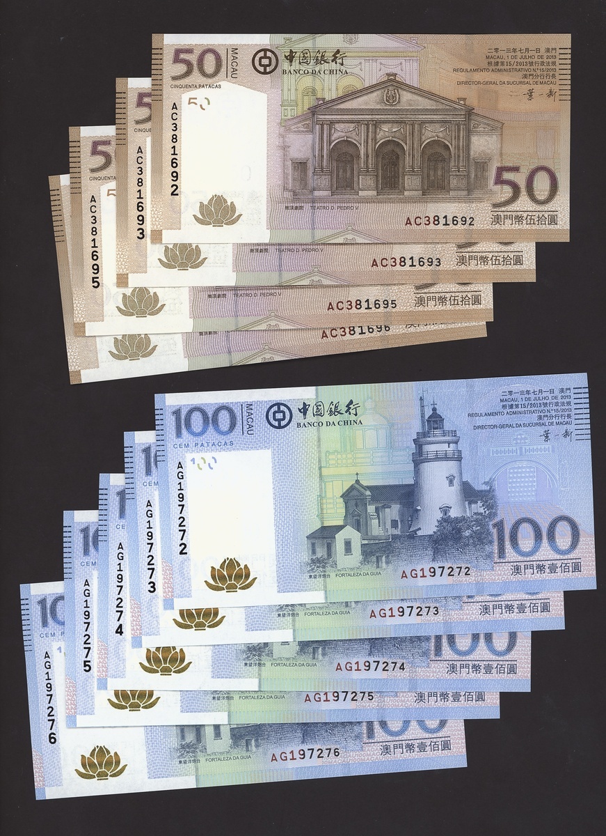 (x) Bank of China, Macau, a group of consecutive 10 (5), 20 (5), 50 (4) and 100 (5) patacas, 2013, (Pick 108-111), crisp uncirculated (19 notes)