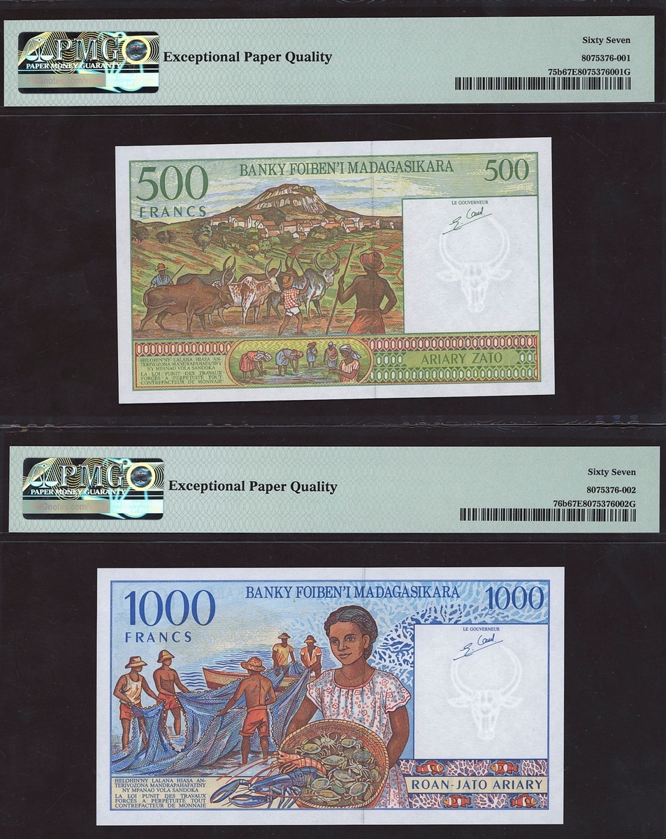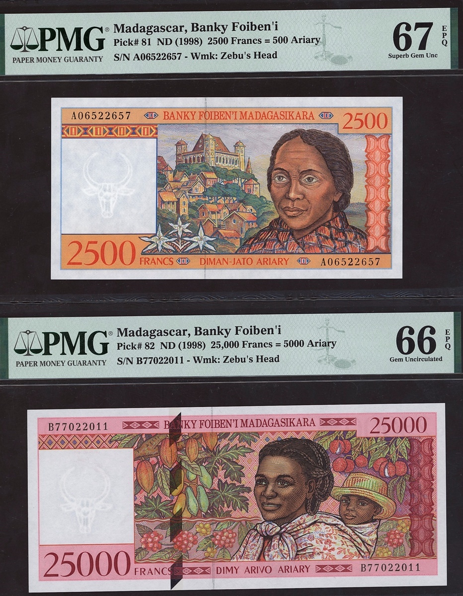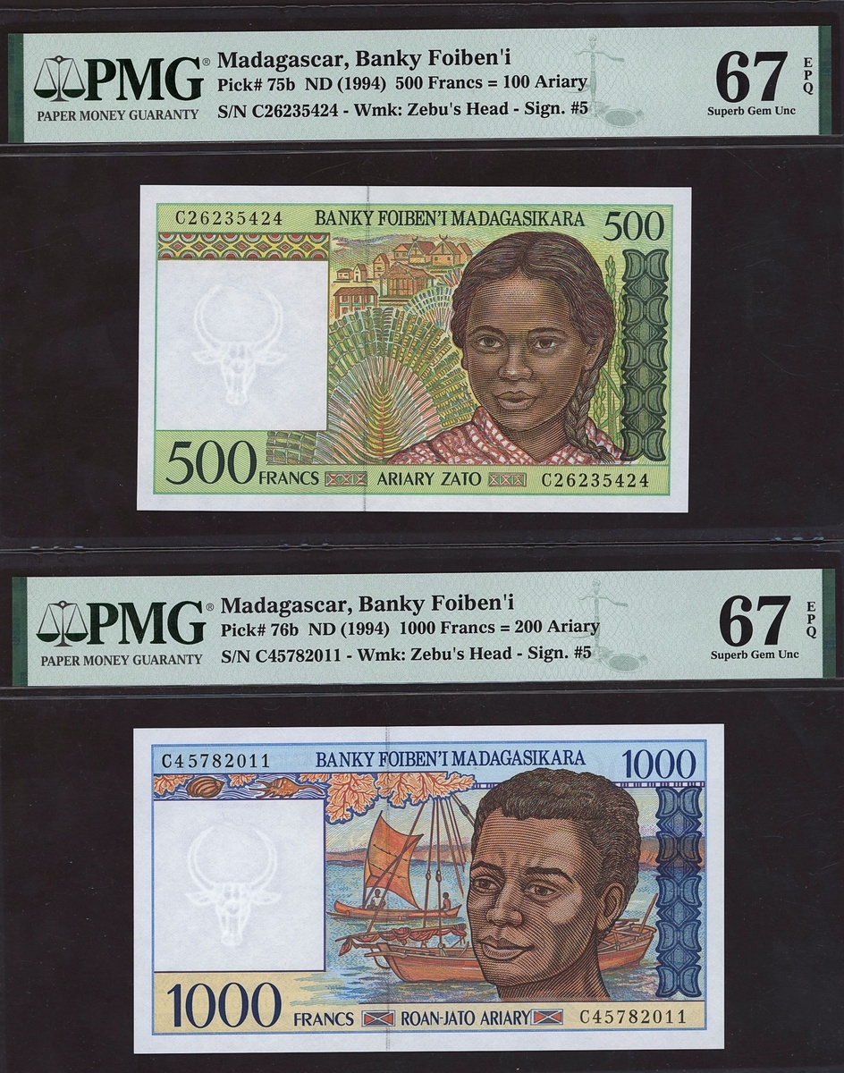 (x) Banky Foiben'i, Madagascar, Group of 100, 200, 500, 1000, 2000, 5000 ariary, (Pick 75b (2), 78b, 79b, 81, 82), In PMG holder 67 EPQ Superb Gem Unc (4), 66 EPQ Gem Uncirculated (2), (6 notes).