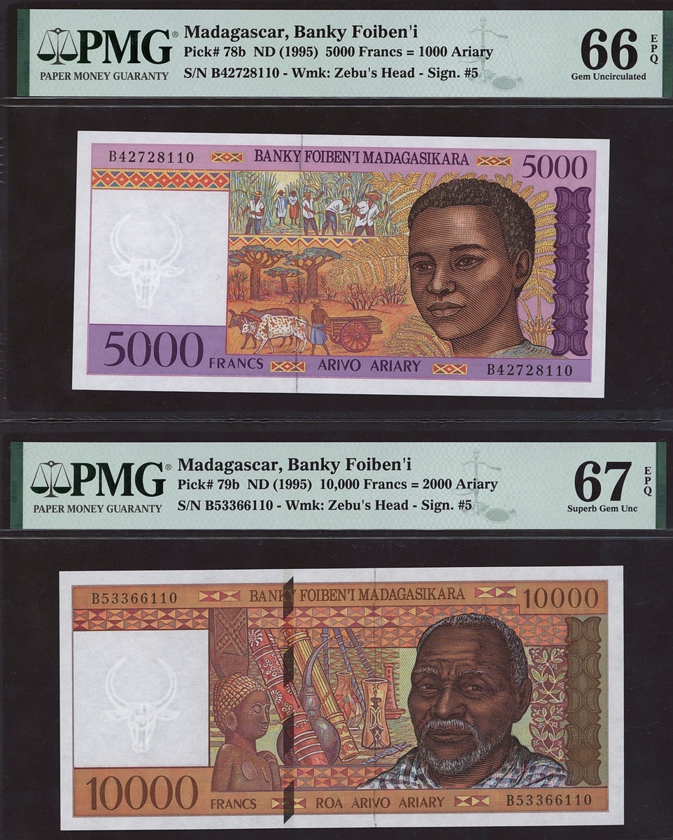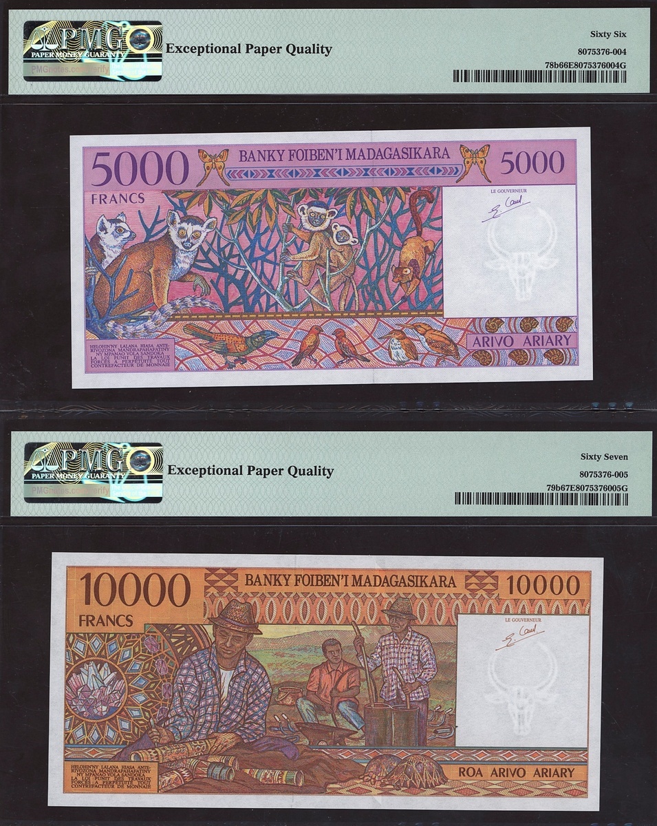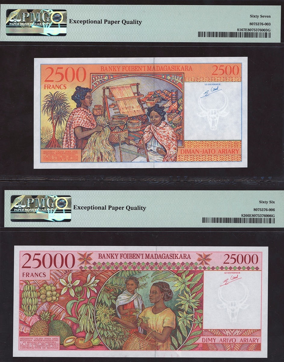 (x) Banky Foiben'i, Madagascar, Group of 100, 200, 500, 1000, 2000, 5000 ariary, (Pick 75b (2), 78b, 79b, 81, 82), In PMG holder 67 EPQ Superb Gem Unc (4), 66 EPQ Gem Uncirculated (2), (6 notes).