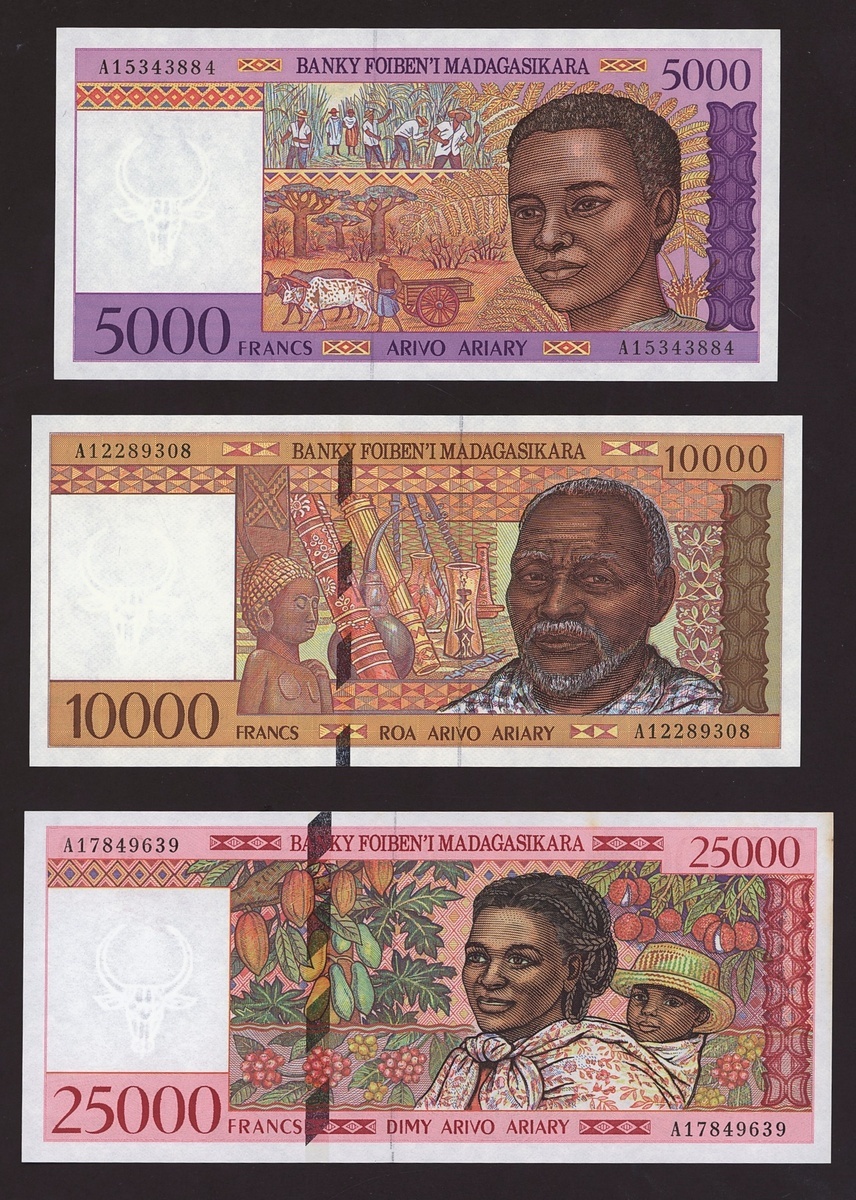 (x) Banky Foiben'I Madagasikara, a full set of the 1994-98 issues, including 500, 1000, 25005000, 10000 and 25000 francs, (Pick 75-82), 25000 francs with minor foxing at right margin, otherwise all uncirculated (6 notes)