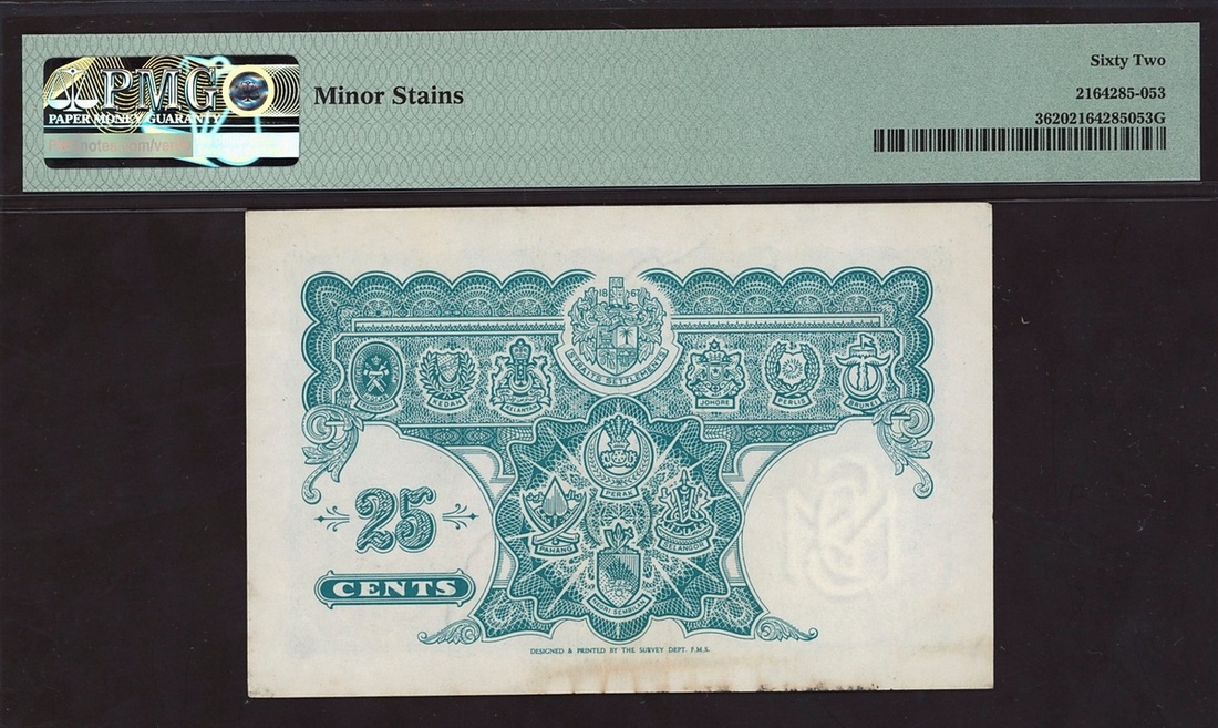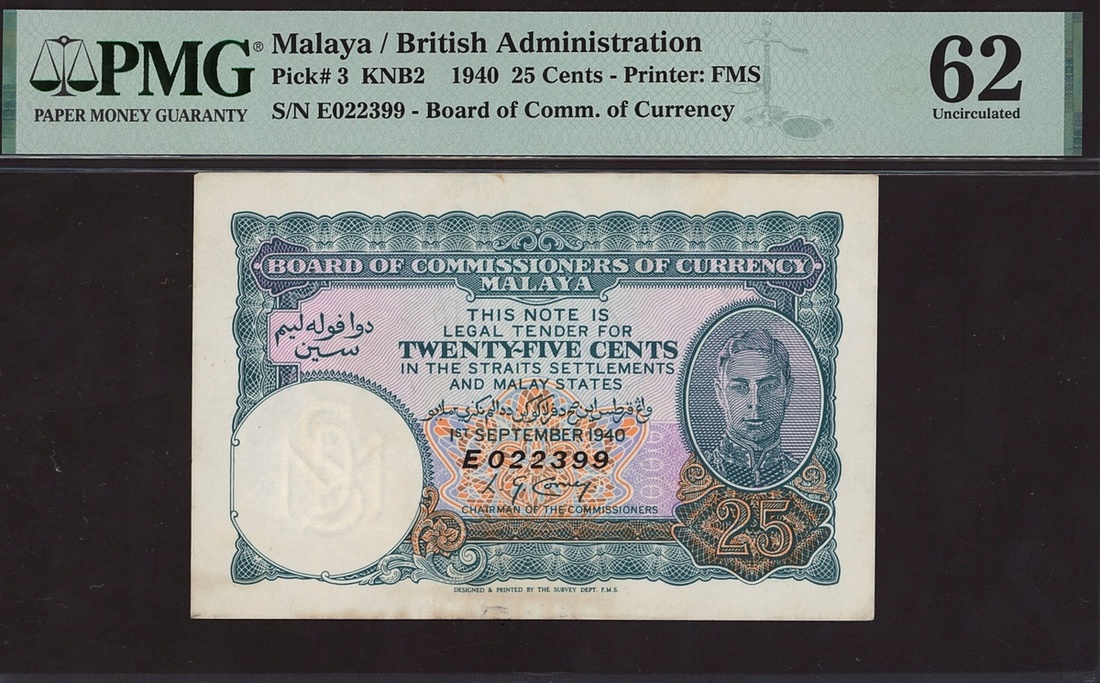 Board of Commissioners of Currency Malaya (British Administration), 25 cents, 1940, serial number E022399, (Pick 3), in PMG holder 62 Uncirculated, minor stains