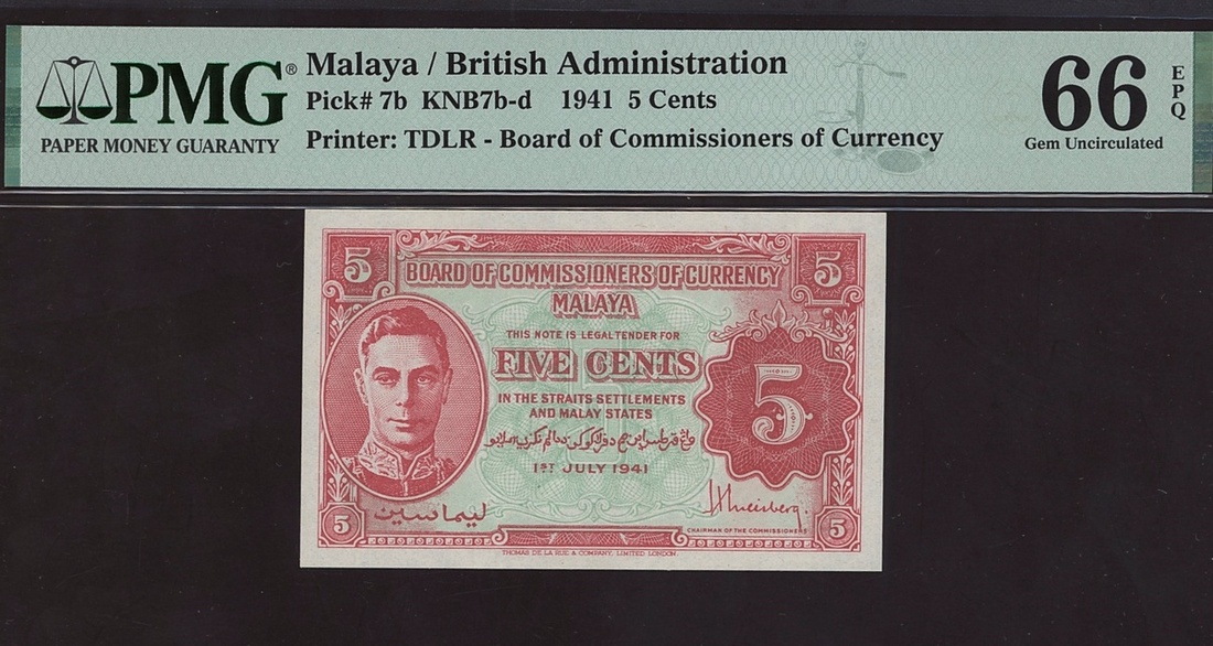 Board of Commissioners of Currency (British Administration), 5 cents, 1941, (Pick 7b), in PMG holder 66 Gem Uncirculated