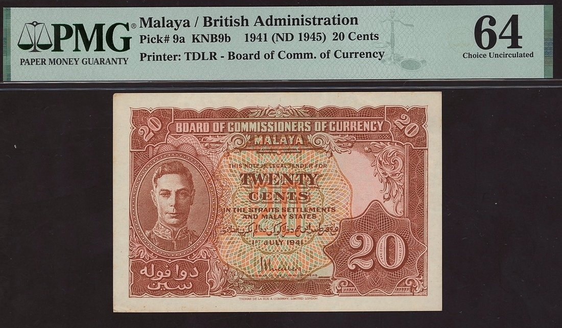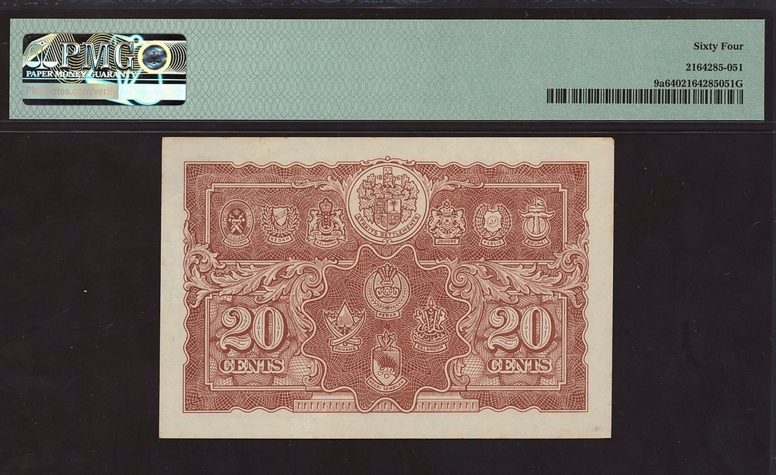 Board of Commissioners of Currency Malaya (British Administration), 20 cents, 1941 (ND 1945), (Pick 9a), in PMG holder 64 Choice Uncirculated