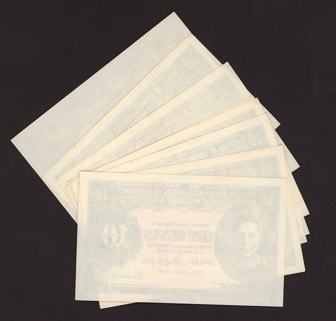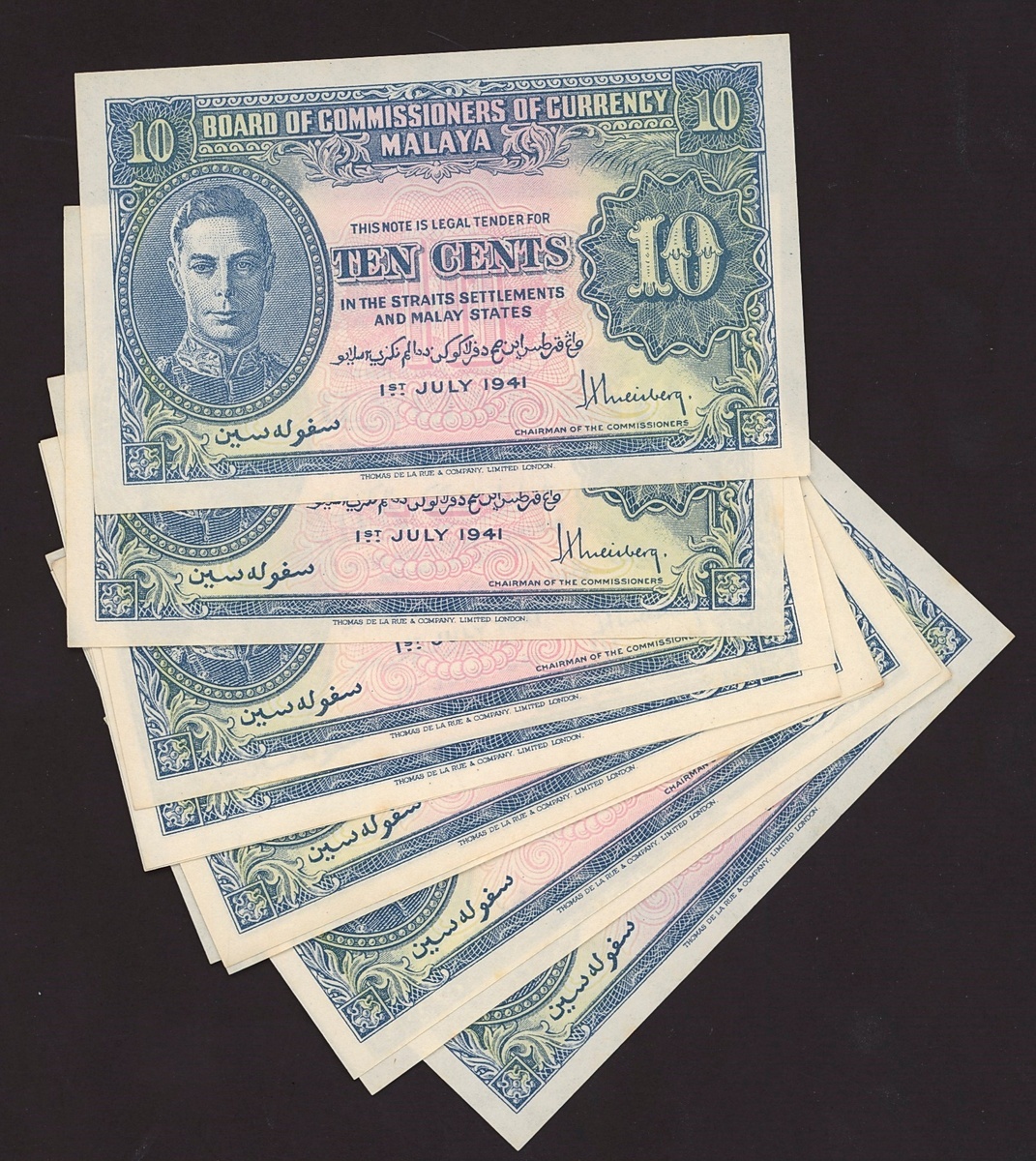 (x) Board of Commissioners of Currency, Malaya, 10 cents (11), 1 July 1941, (Pick 8, BNB B109a), lightly handling, generally about uncirculated or better (11 notes)