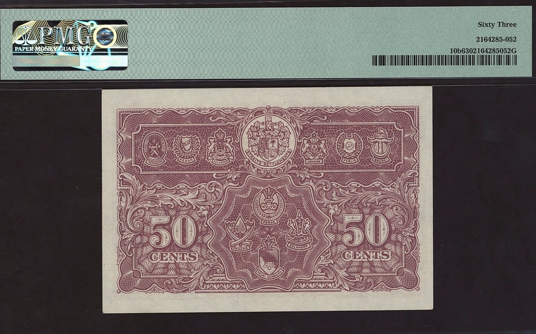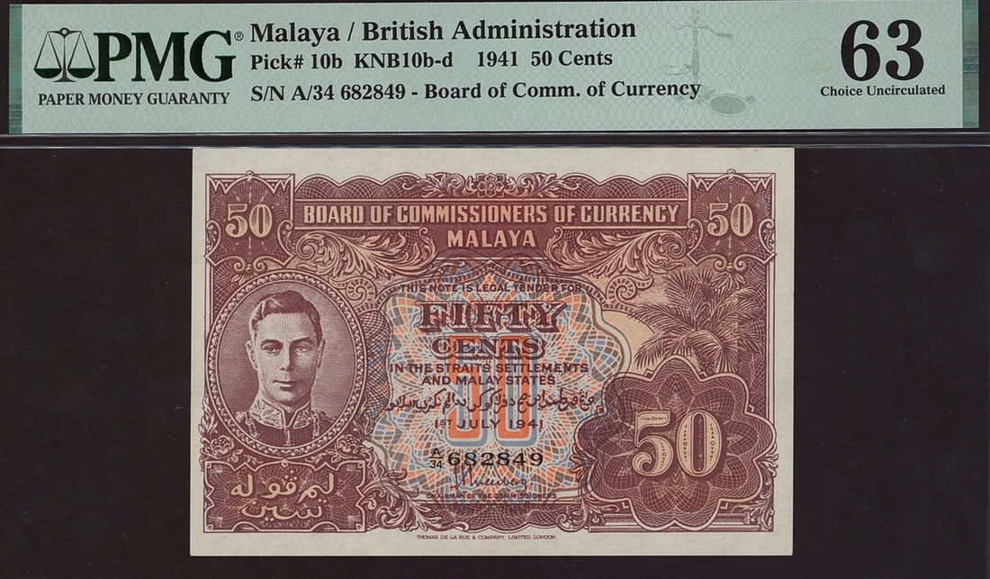 Board of Commissioners of Currency Malaya (British Administration), 50 cents, 1941, serial number A/34 682849, (Pick 10b), in PMG holder 63 Choice Uncirculated