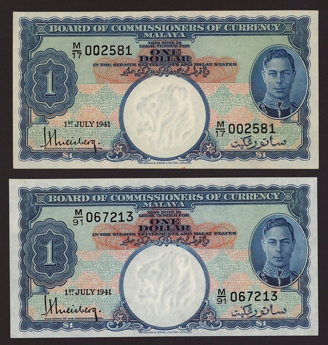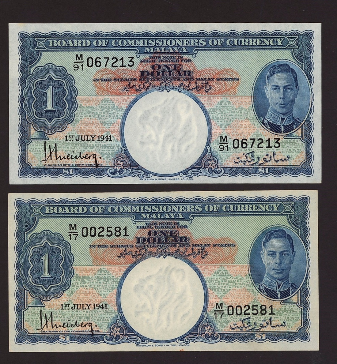 (x) Board of Commissioners of Currency, Malaya, $1 (2), 1 July 1941, prefix M/17, M/91, (Pick 11a, BNB B112a), first with minor foxing, both about uncirculated (2 notes)