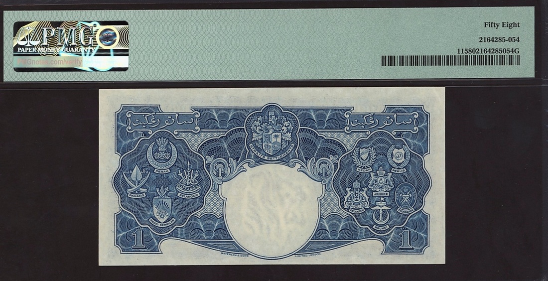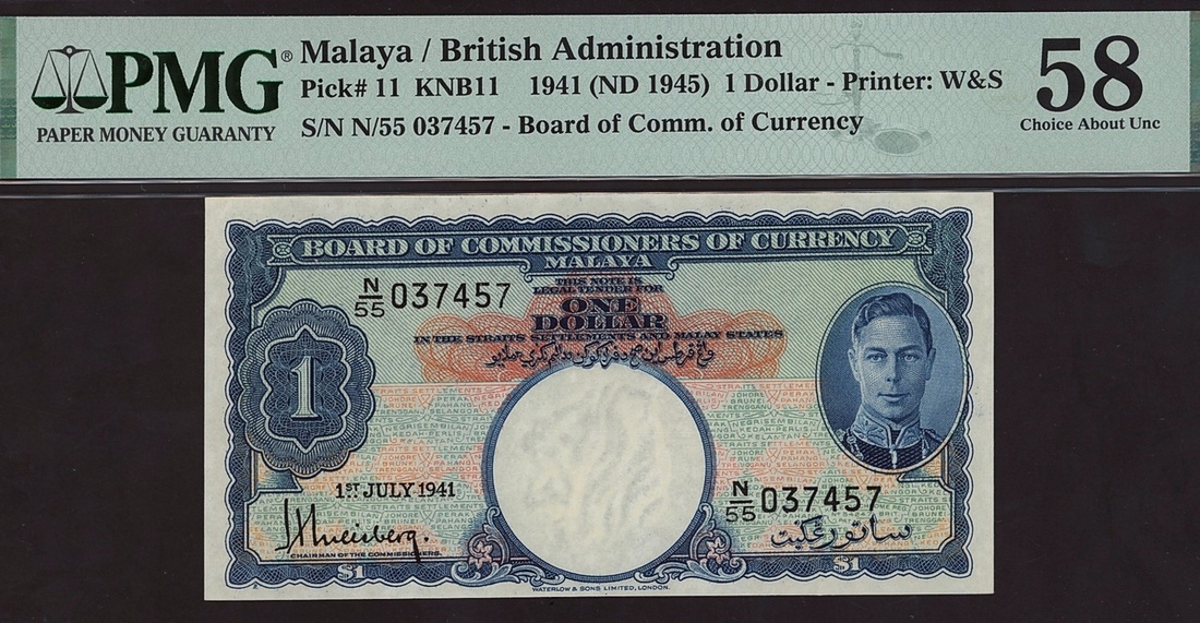 Board of Commissioners of Currency Malaya (British Administration), 1 dollar, 1941 (ND 1945), serial number N/55 037457, (Pick 11), in PMG holder 58 Choice About Unc