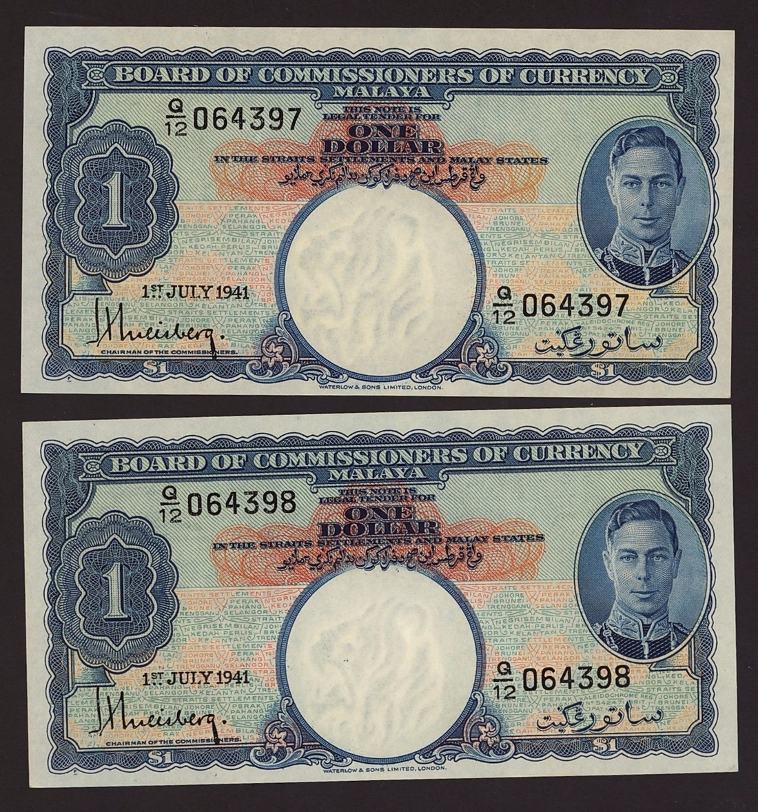 (x) Board of Commissioners of Currency, Malaya, consecutive pair of $1, 1 July 1941, serial number Q/12 064397/98, (Pick 11a, BNB B112), two light folds, good extremely fine (2 notes)