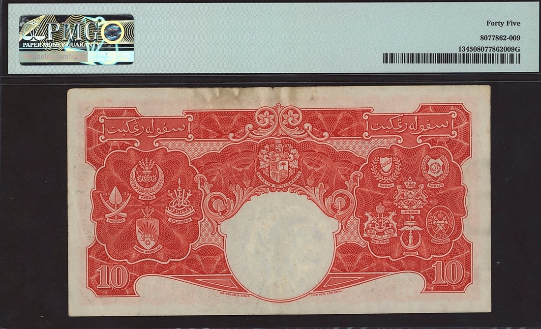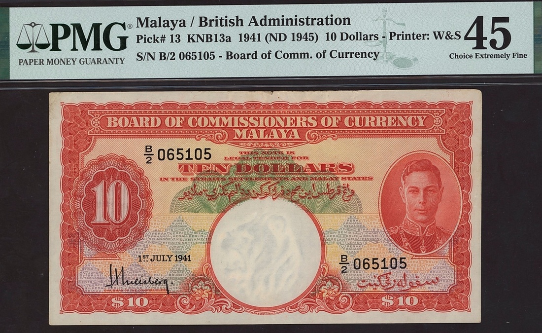 (x) Board of Commissioners of Currency, Malaya, $10, 1 July 1941, serial number B/2 065105, (Pick 13, BNB B114), in PMG holder 45 Choice Extremely Fine