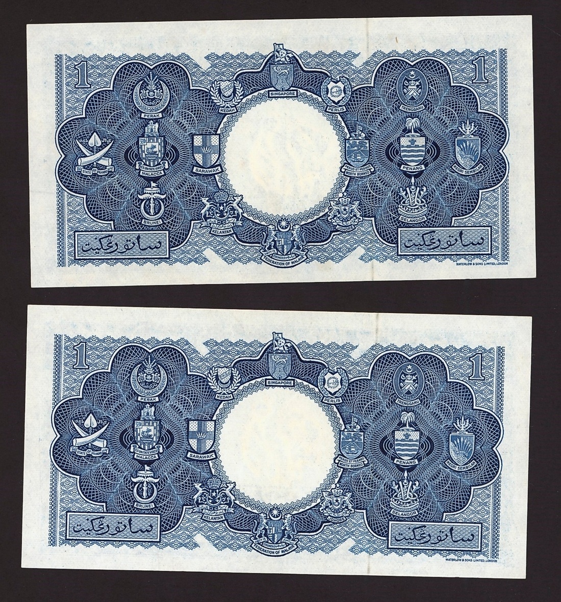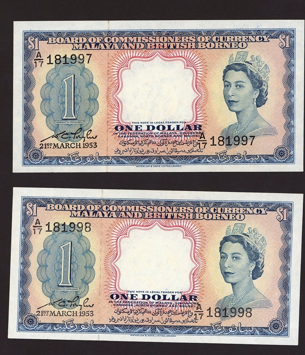 (x) Board of Commissioners of Currency Malaya and British Borneo, consecutive pair of $1, 21 March 1953, serial number A/17 181997/98, (Pick 1, BNB B101), pressed, extremely fine (2 notes)