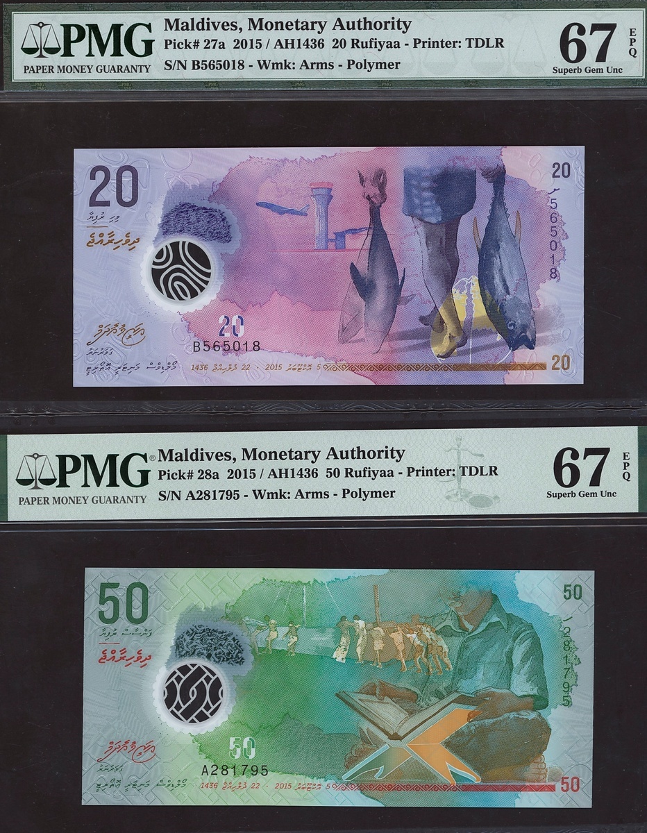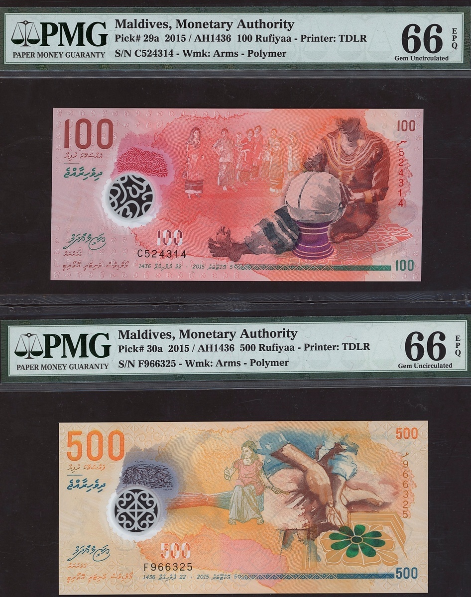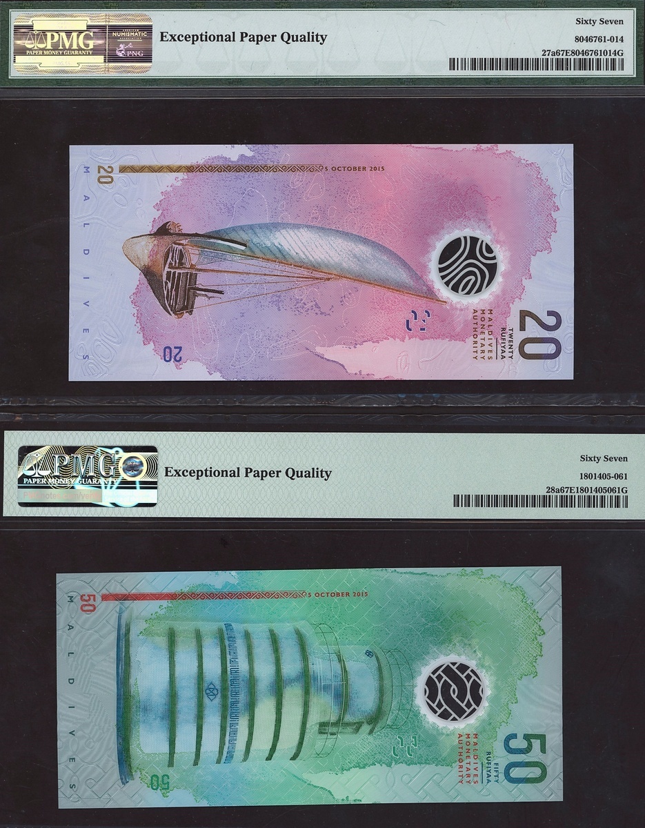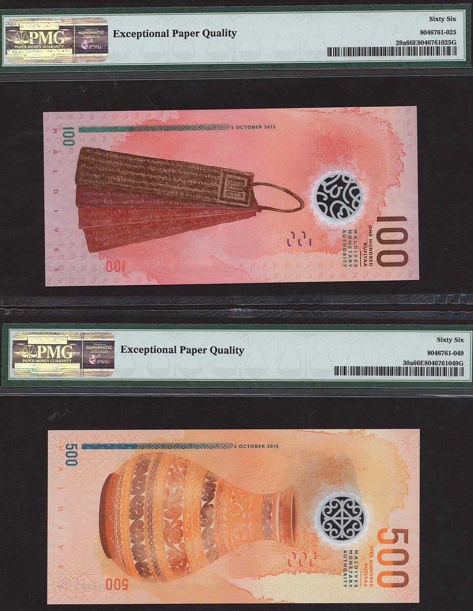 (x) Monetary Authority, Maldives, Group of 20, 50, 100 & 500 rufiyaa, (Pick 27a, 28a, 29a, 30a), In PMG holder 67 EPQ Superb Gem Unc (2), 66 EPQ Gem Uncirculated (2), (4 notes).