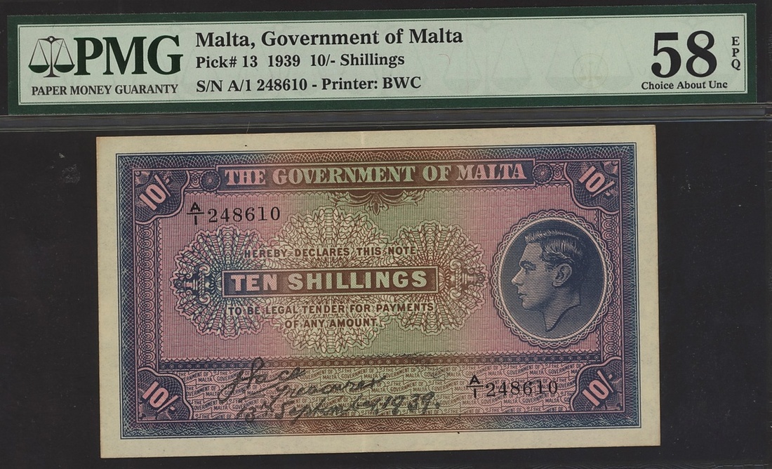 (x) Government of Malta, 10 shillings, 1939, serial number A/1 248610, (Pick 13), in PMG holder 58 EPQ Choice About Unc, only 1 example in a higher grade on PMG Census, quite scarce