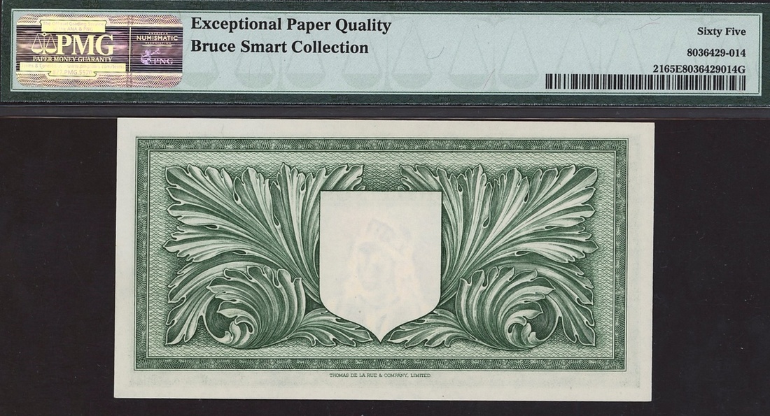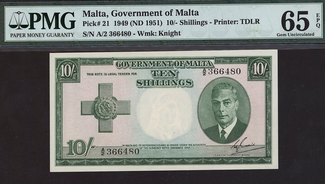 (x) Government of Malta, 10 shillings, 1949 (ND 1951), serial number A/2 366480, (Pick 21), in PMG holder 65 EPQ Gem Uncirculated. Only five examples in a higher grade, quite scarce in this grade. Ex Bruce Smart Collection.