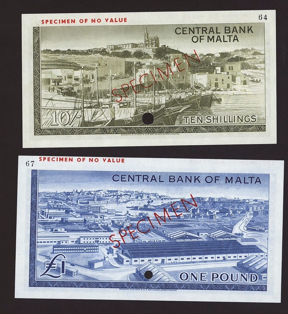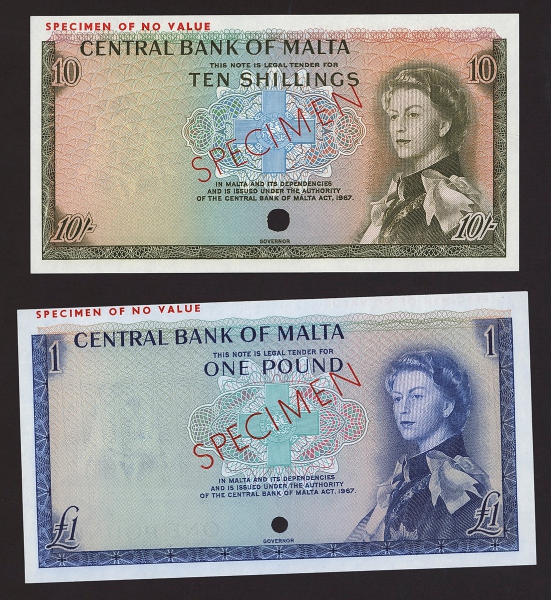 Central Bank of Malta, Colour trial 10 shillings and 1 pound, 1967, number 67 and 64, (Pick 28ct, 29ct), uncirculated (2 notes).
