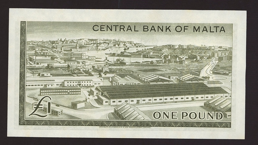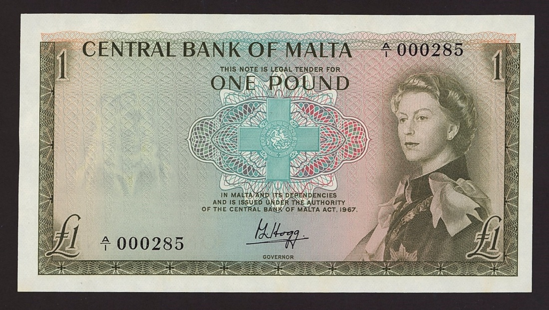 Central Bank of Malta, 1 pound, 1967, serial number A/1 000285, (Pick 29a, B202a), about uncirculated.