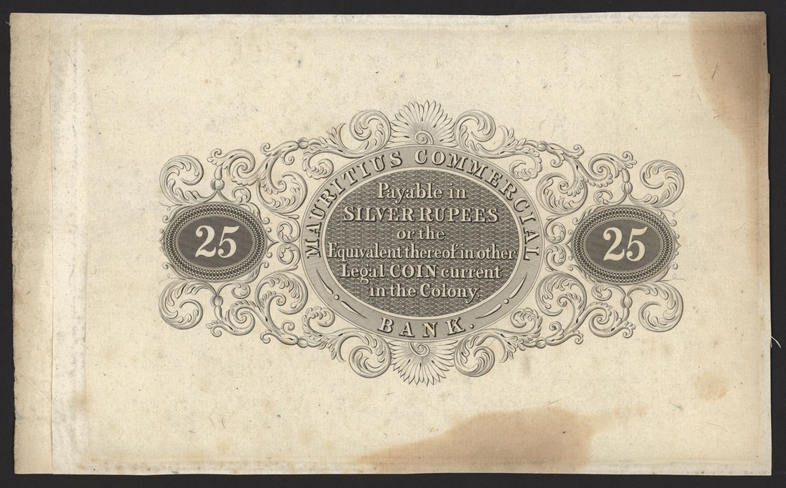 Mauritius Commercial Bank, reverse proof for a proposed 25 silver rupees, ND (1838-40), uniface, black and white, value at left and right,