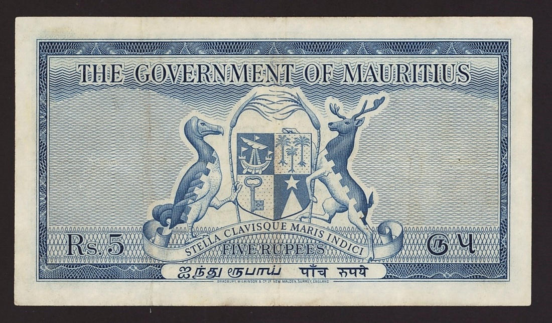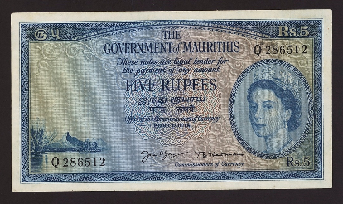 The Government of Mauritius, 5 rupees, ND (1965), serial number Q286512, (Pick 27e, B324e), fine, pressed.