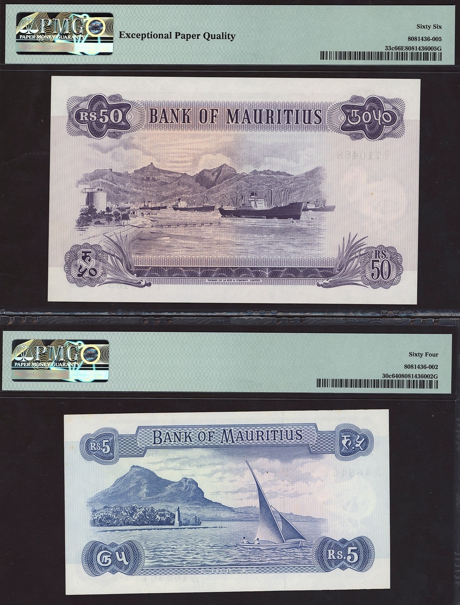 (x) Bank of Mauritius, 50 rupees, ND (1967), serial number A/5 710488, also a 5 rupees,