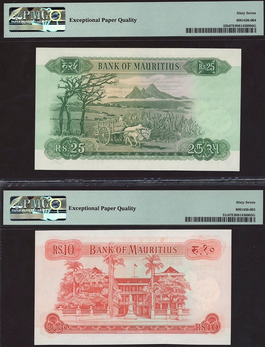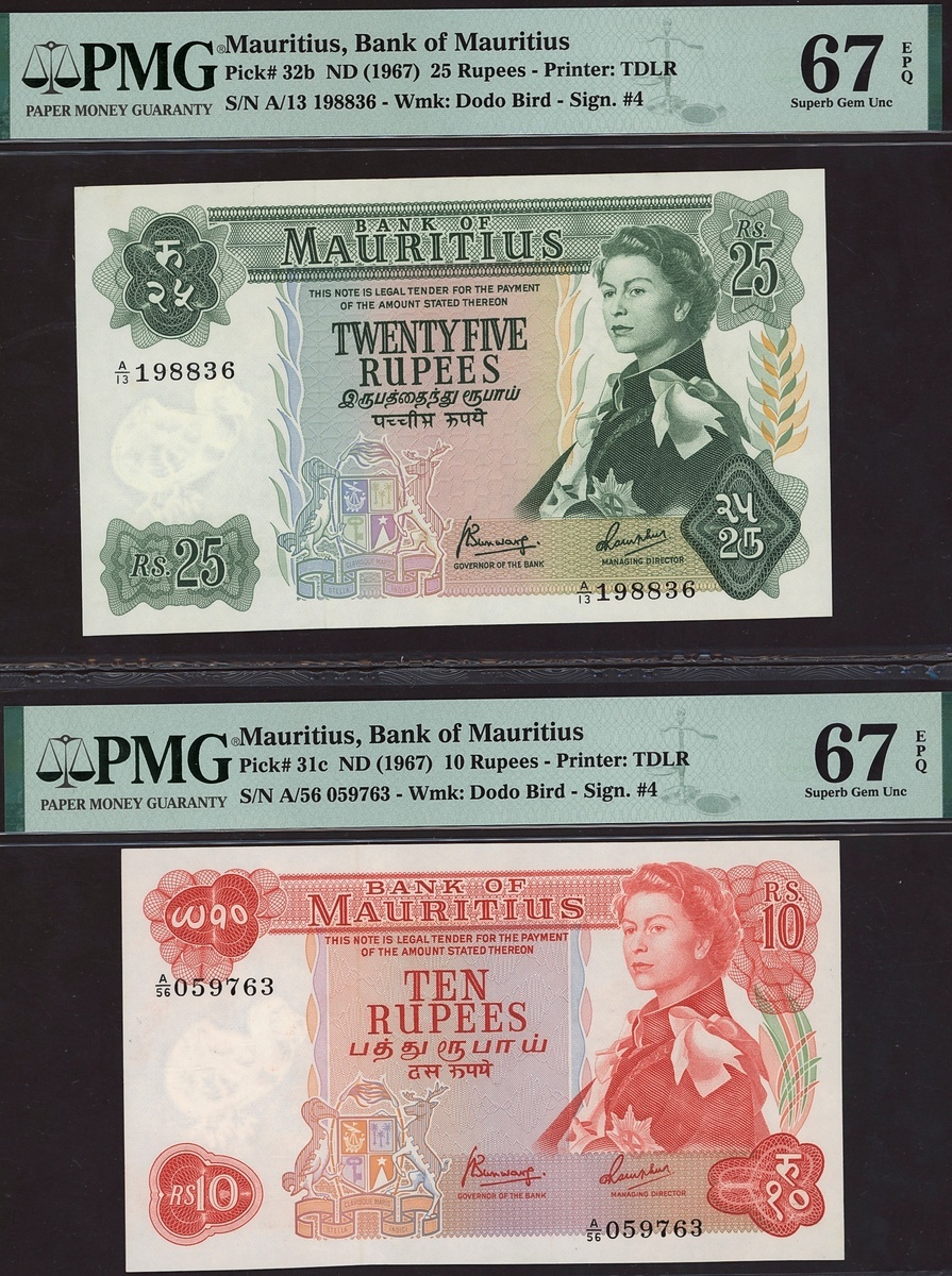 (x) Bank of Mauritius, 25 rupees, ND (1967), serial number A/13 198836, also a 10 rupees,