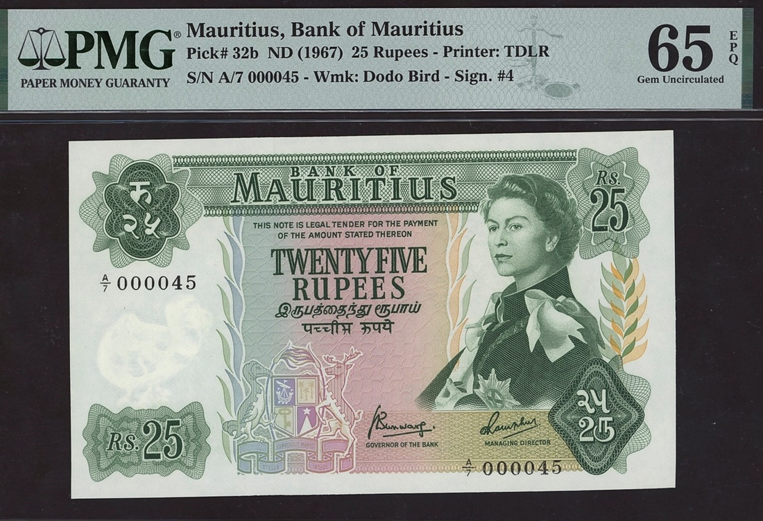 (x) Bank of Mauritius, 25 rupees, ND (1967), serial number A/7 000045, (Pick 32b, BNB B403b), in PMG holder 65 EPQ Gem Uncirculated