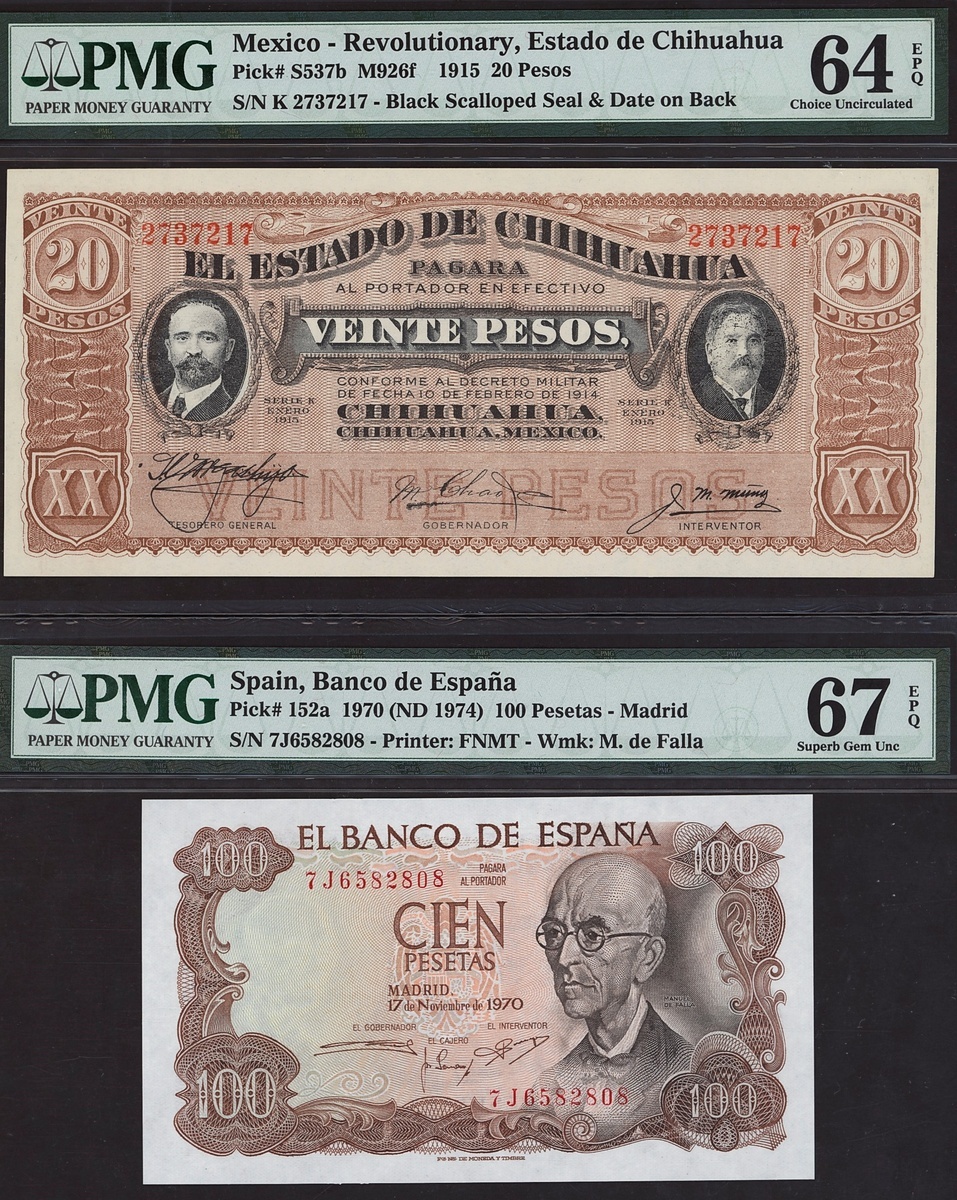 (x) Mexico, 20 pesos, 1915, also a Spain 100 pesetas,