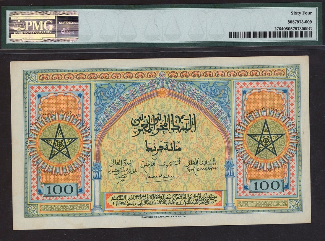 (x) Banque d'etat du Maroc, 100 francs, 1943-44, serial number O544 564, (Pick 27), in PMG holder 64 Choice Uncirculated