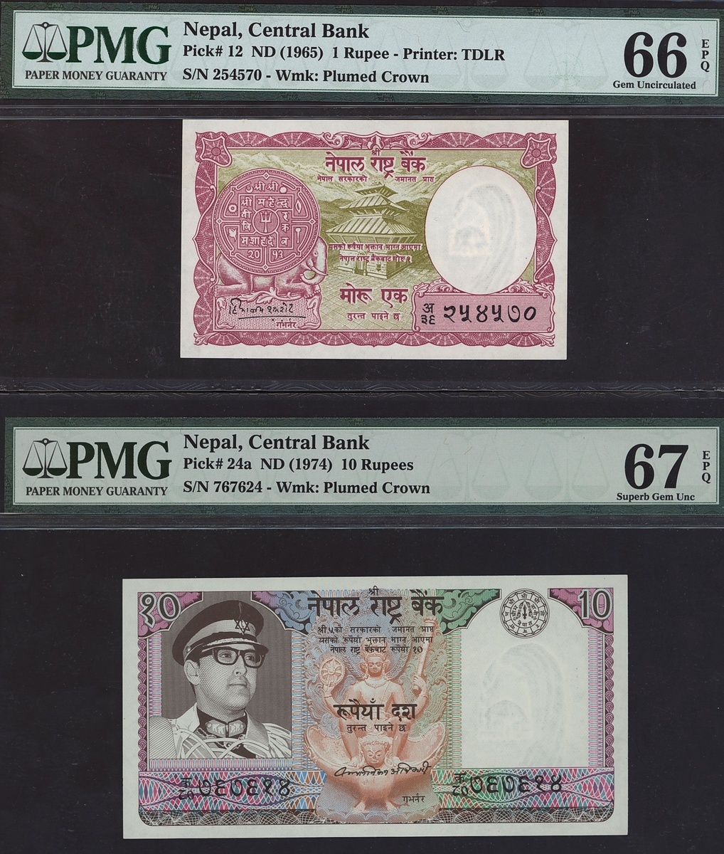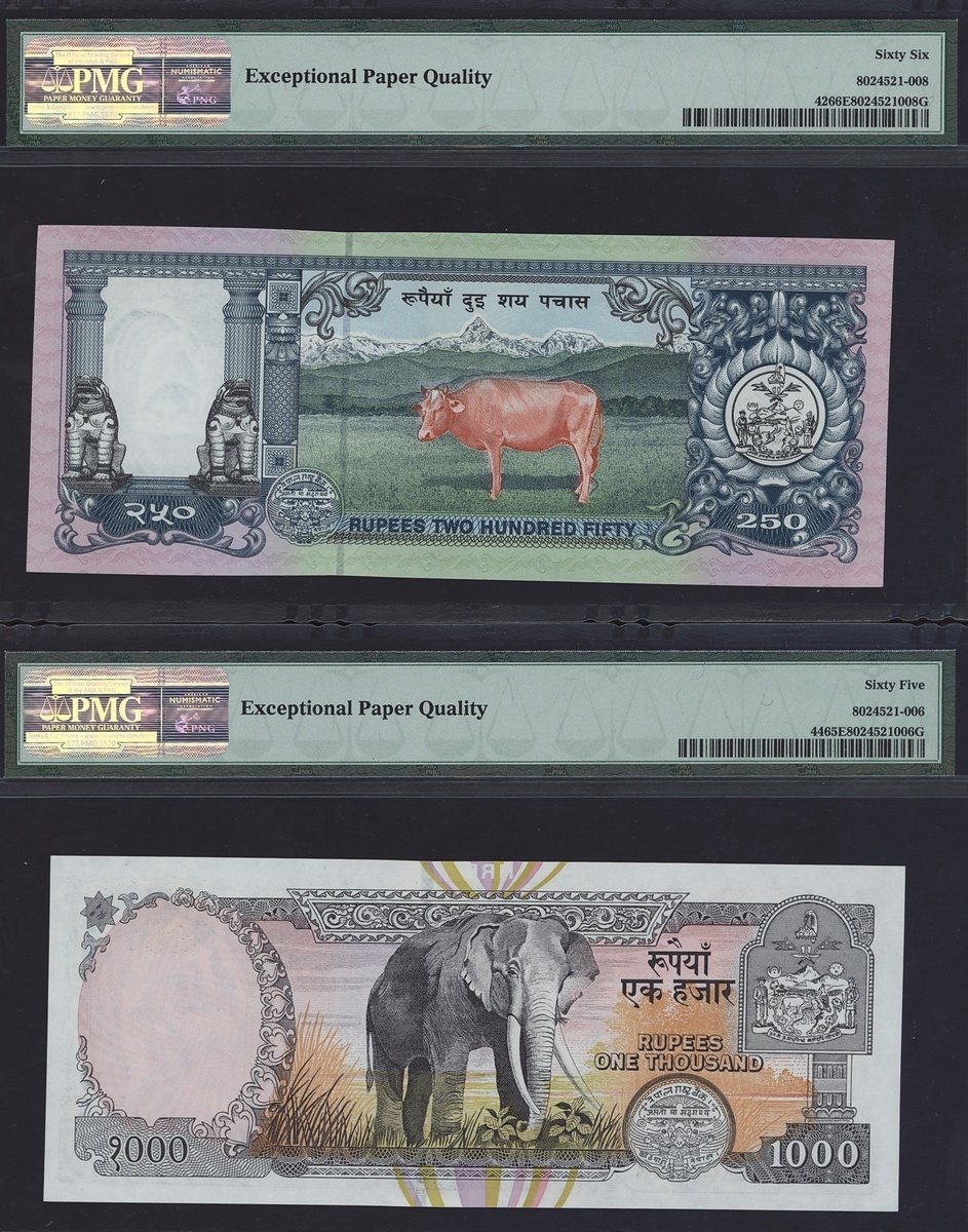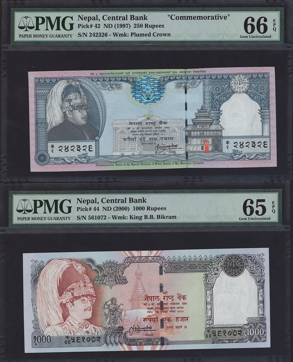 (x) Central Bank, Nepal Group of 1, 10, 250, 1000 rupees, ND (1965, 1974, 1997, 2000), (Pick 12, 24a, 42, 44), In PMG holder 67 EPQ Superb Gem Unc (1), 66 EPQ Gem Un (3), (4 notes).