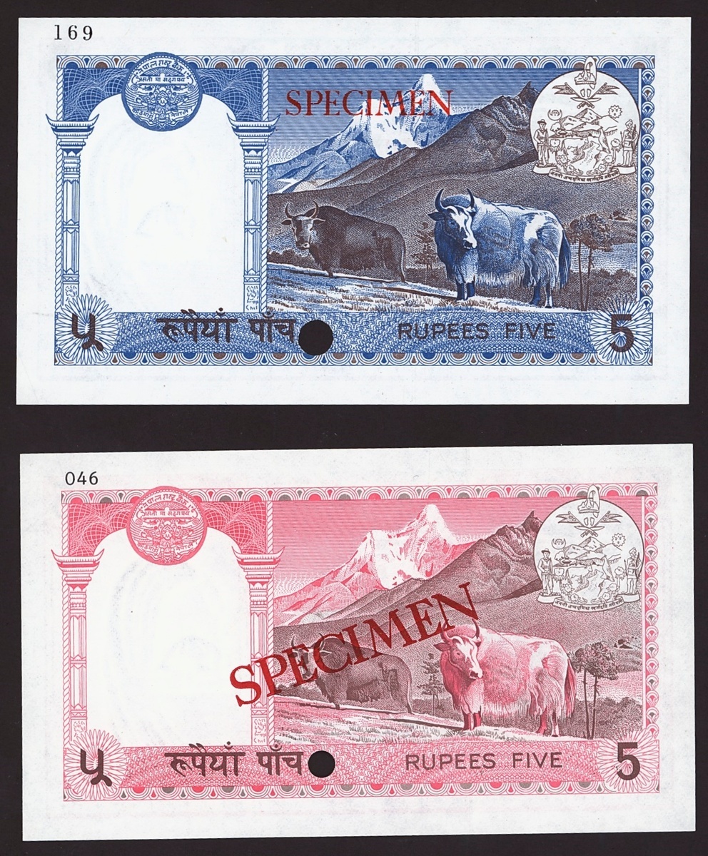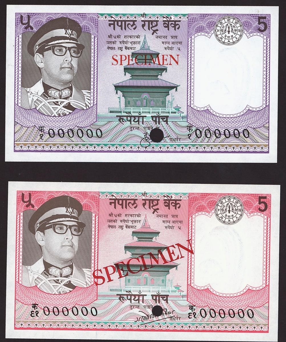 Nepal Rastra Bank, Colour trial and specimen 5 rupees, ND (1974), Colour trial in purple.