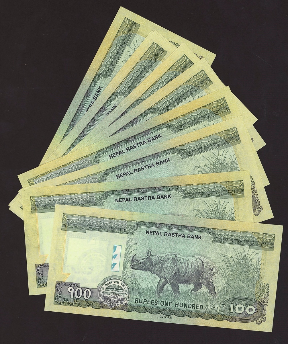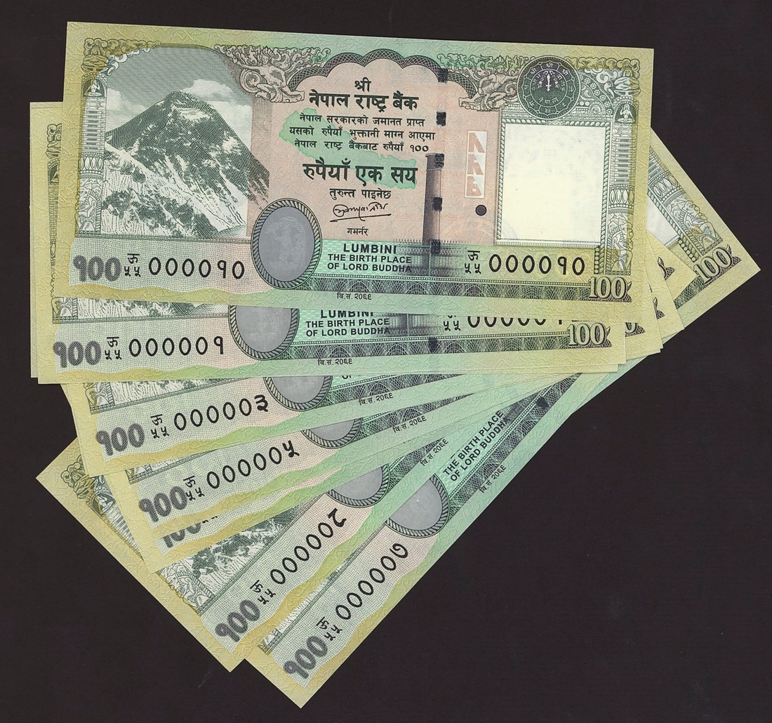 (x) Nepal Rastra Bank, low number set 100 rupees, 2013, serial number 000001-10, (Pick 73), uncirculated (10 notes)