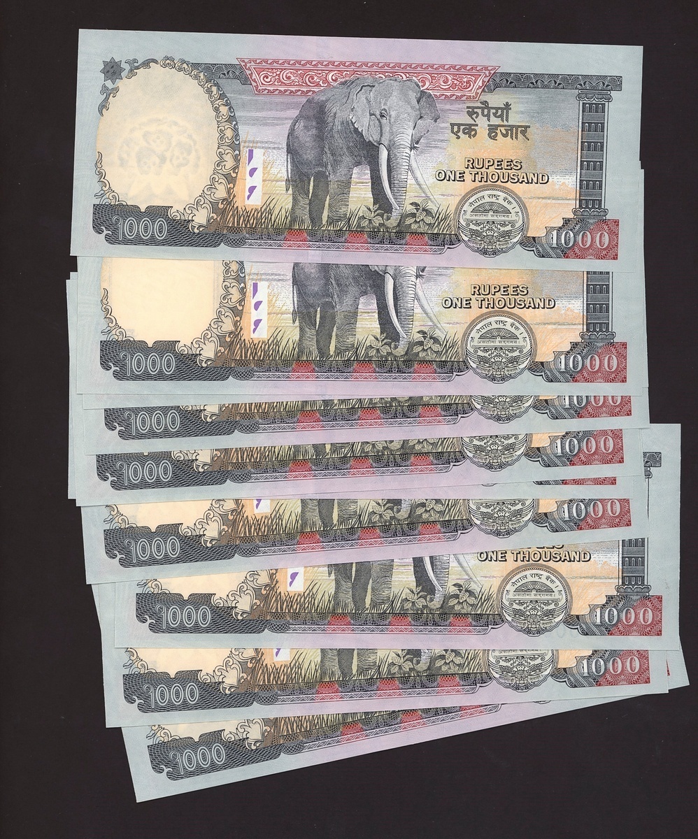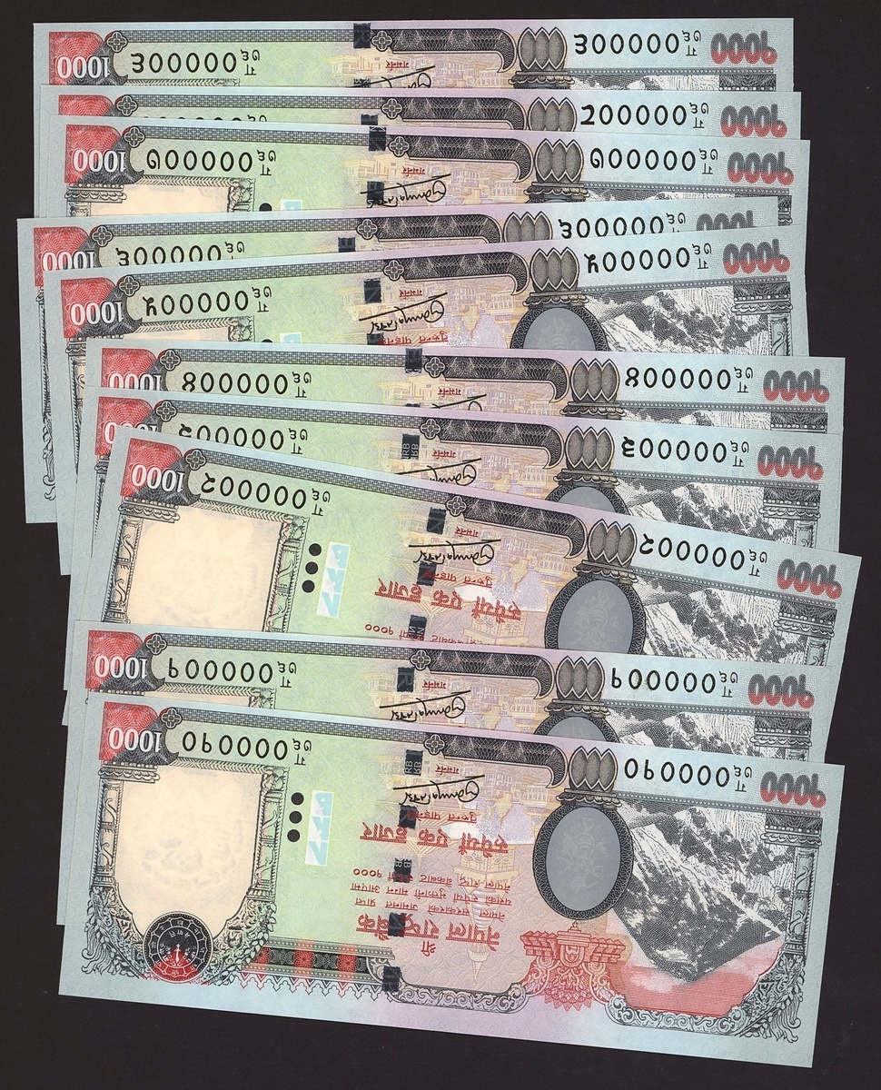 (x) Nepal Rastra Bank, low number set 1000 rupees, 2013, serial number 000001-10, (Pick 75), uncirculated (10 notes)