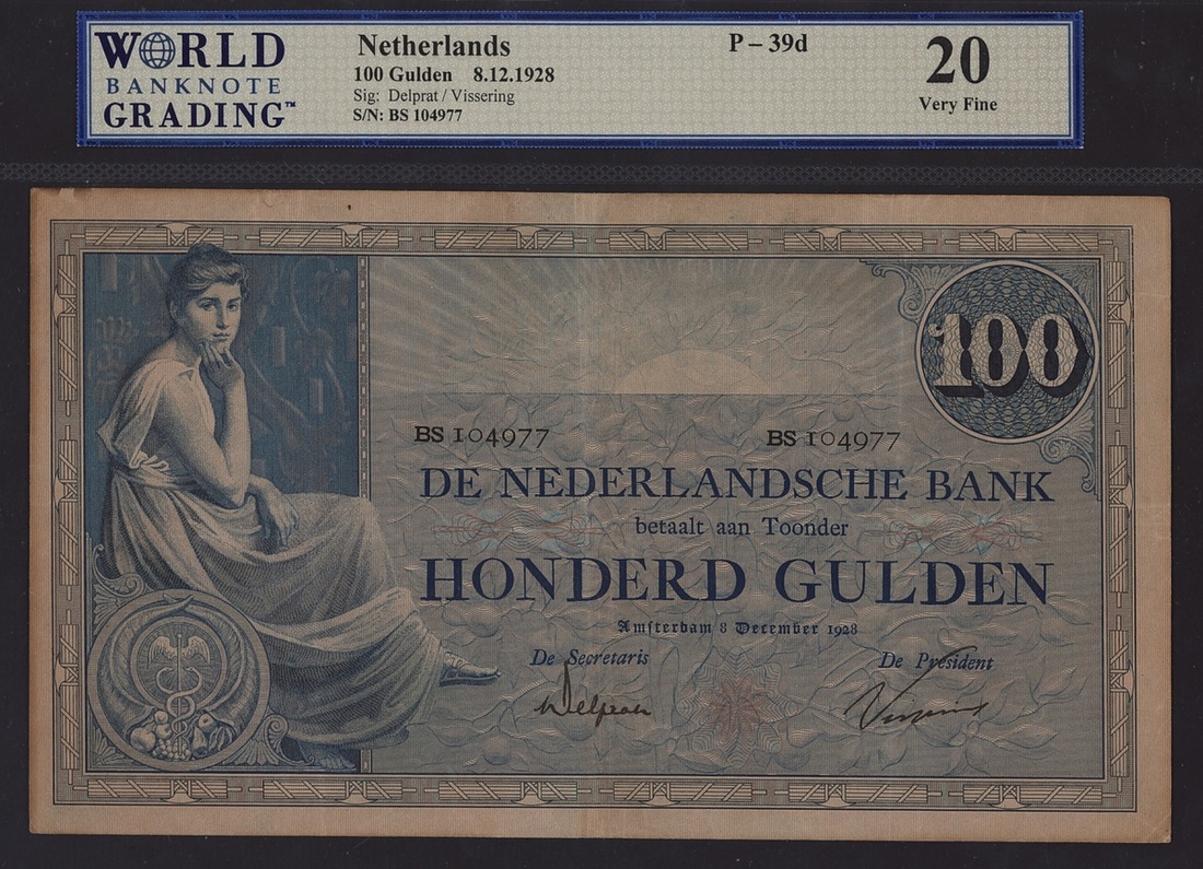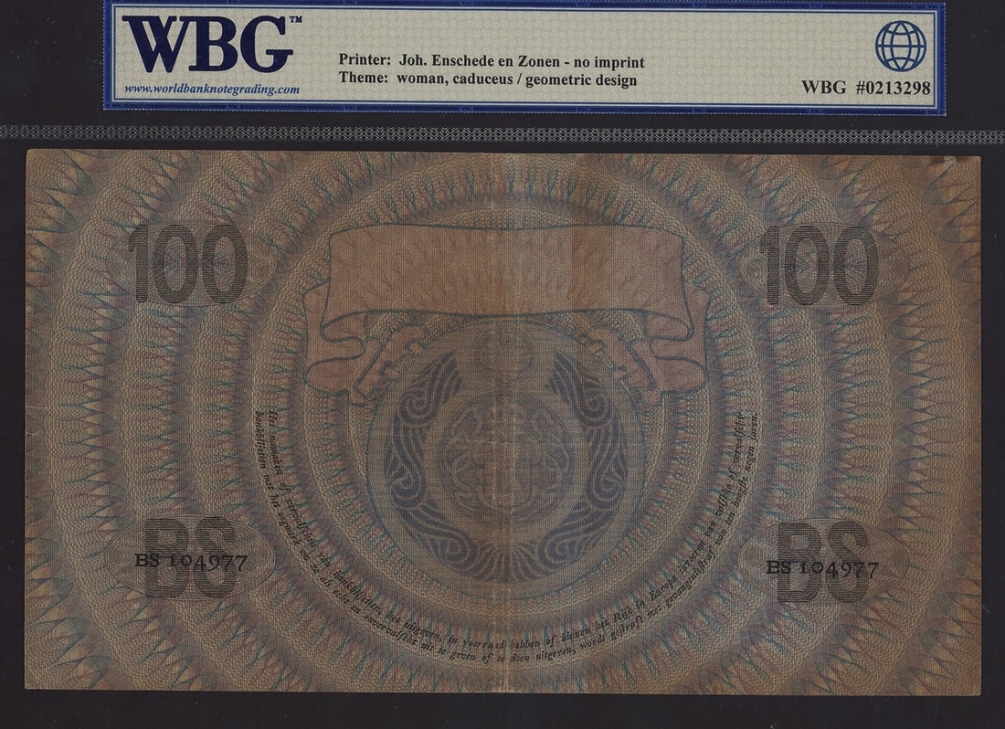 (x) De Nederlandsche Bank, 100 gulden, 8 December 1928, serial number BS104977, (Pick 39d), in WBG holder 20 Very Fine