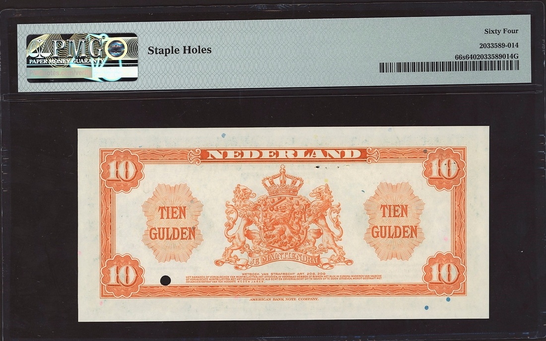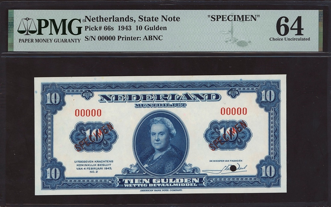 (x) Nederland Muntbiljet, Netherlands, specimen 10 gulden, 1943, red serial number 00000, (Pick 66s), in PMG holder, staple holes, 64 Choice Uncirculated, quite scarce