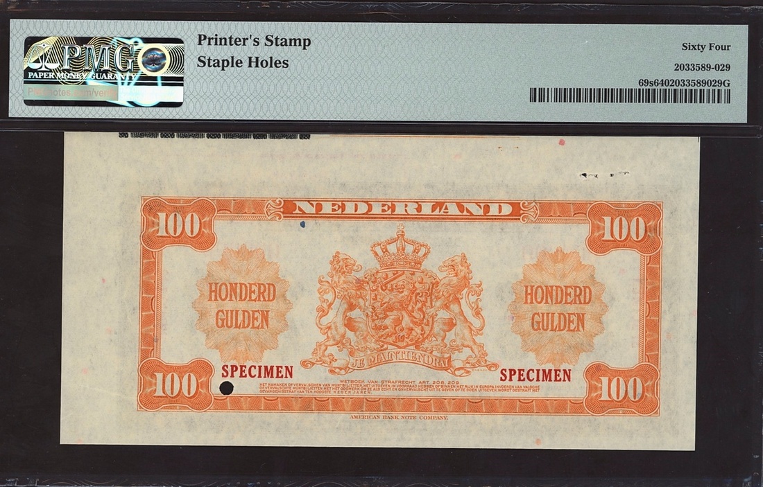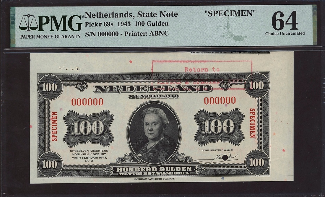 (x) Nederland Muntbiljet, Netherlands, specimen 100 gulden, 1943, red serial number 000000, (Pick 69s), in PMG holder, printer's stampl staple holes, 64 Choice Uncirculated